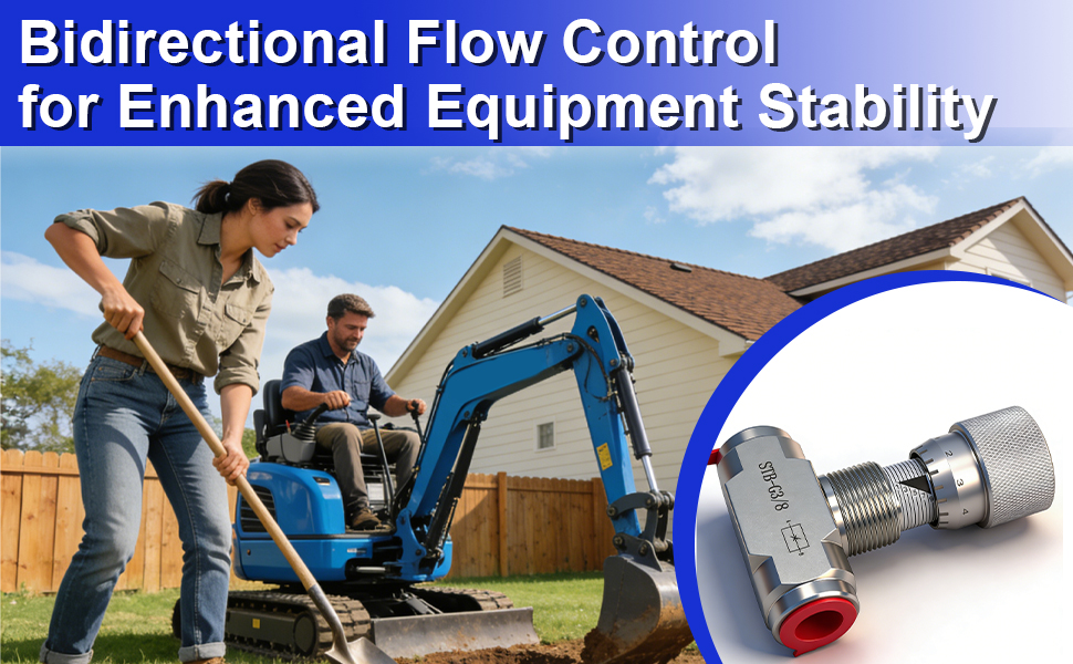 【Precise Two-Way Flow Control】: This hydraulic flow control valve features a restrictor design that allows you to adjust oil flow in both directions. It gives you reliable control over equipment speed and performance for more consistent operation on mini excavators and other machinery