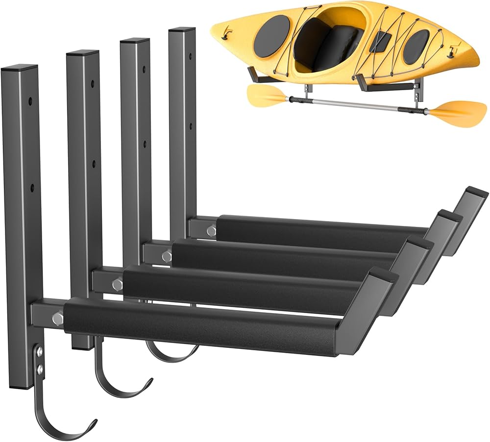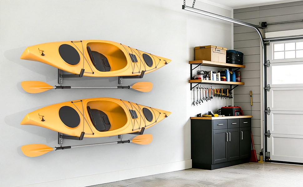 Integrated Paddle Hook: Each kayak rack includes a lower hook for hanging paddles, helping keep your kayak and accessories stored together and neatly organized