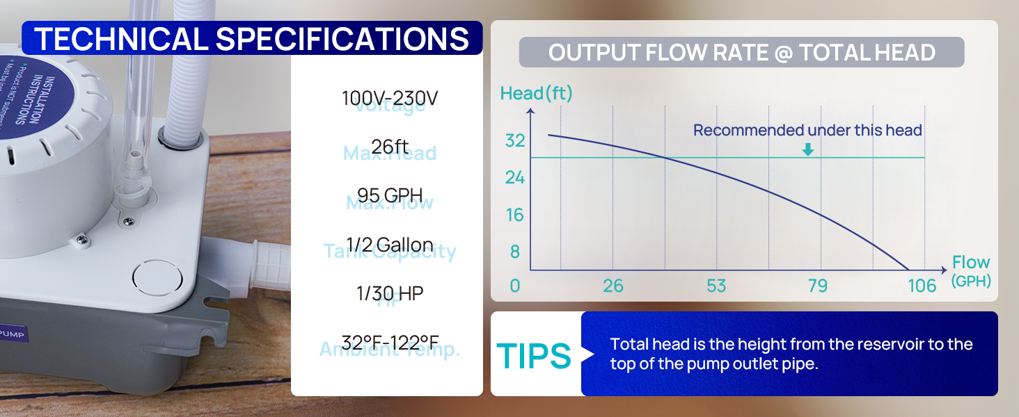 Auto Operation: The 115V/230V condensation pump starts at 2.28 inches and stops at 1.26 inches. The reliable float switch ensures automatic operation. The hvac condensate pump with a 3.3ft UL-certified power cord and 3-prong plug for safety. Clean the reservoir, float, and filter every six months to avoid clogging