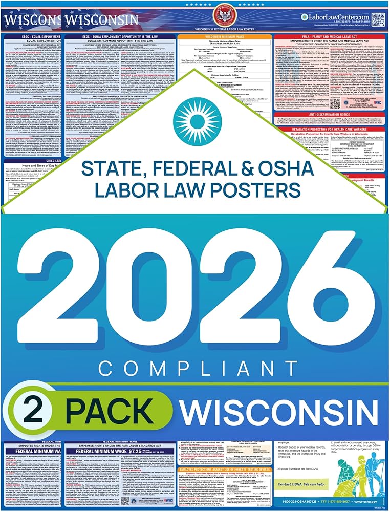 2026 Compliance Solution: Updated Wisconsin labor law poster Spanish 2026 covers OSHA, EEOC, FMLA, and minimum wage requirements. Laminated and waterproof, designed for durability and visibility in workplaces with Spanish-speaking employees
