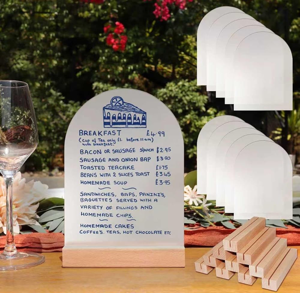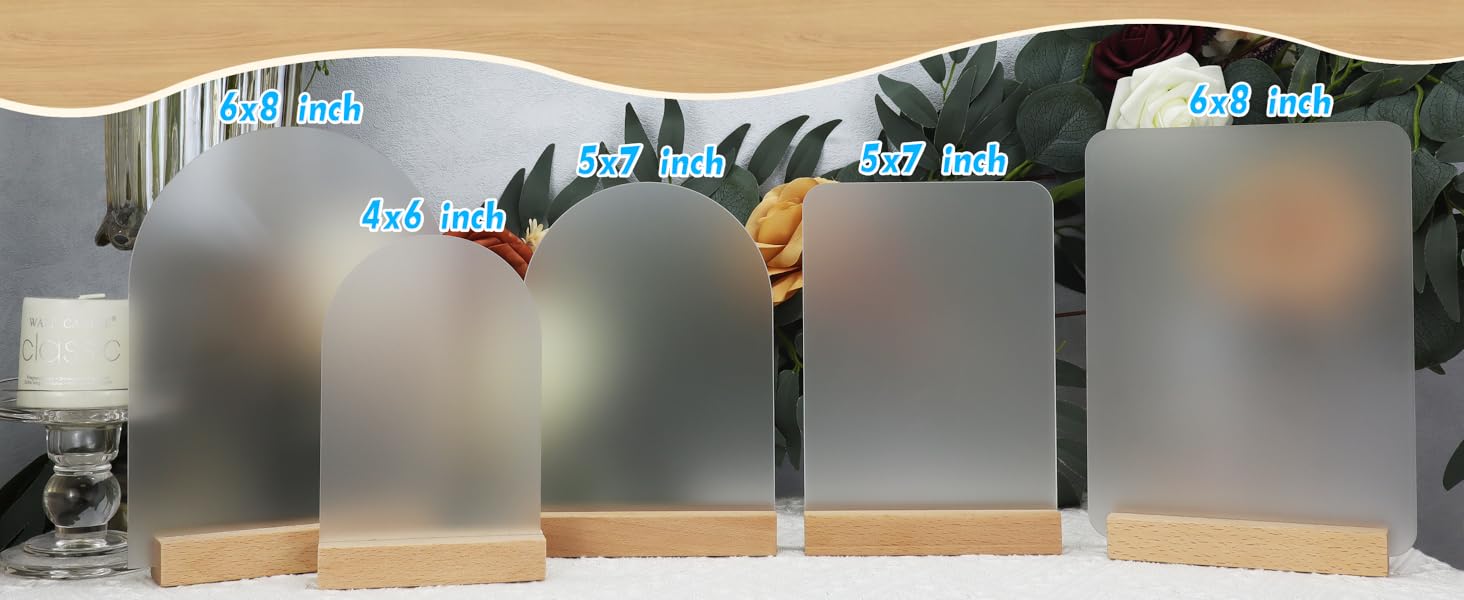PERFECT MATCH - This set includes 10 frosted arch-shaped blank acrylic pieces and 10 wooden sign stands for creating your own DIY wedding signs. Each blank acrylic piece measures 102x152x2mm / 4x6 inches, 1/8 inch thick, and each wood stand measures 102x28x20 mm / 4x1.1x0.8 inches. All acrylic pieces come with protective film on both sides to prevent scratches; simply peel off the film when ready to personalize.
