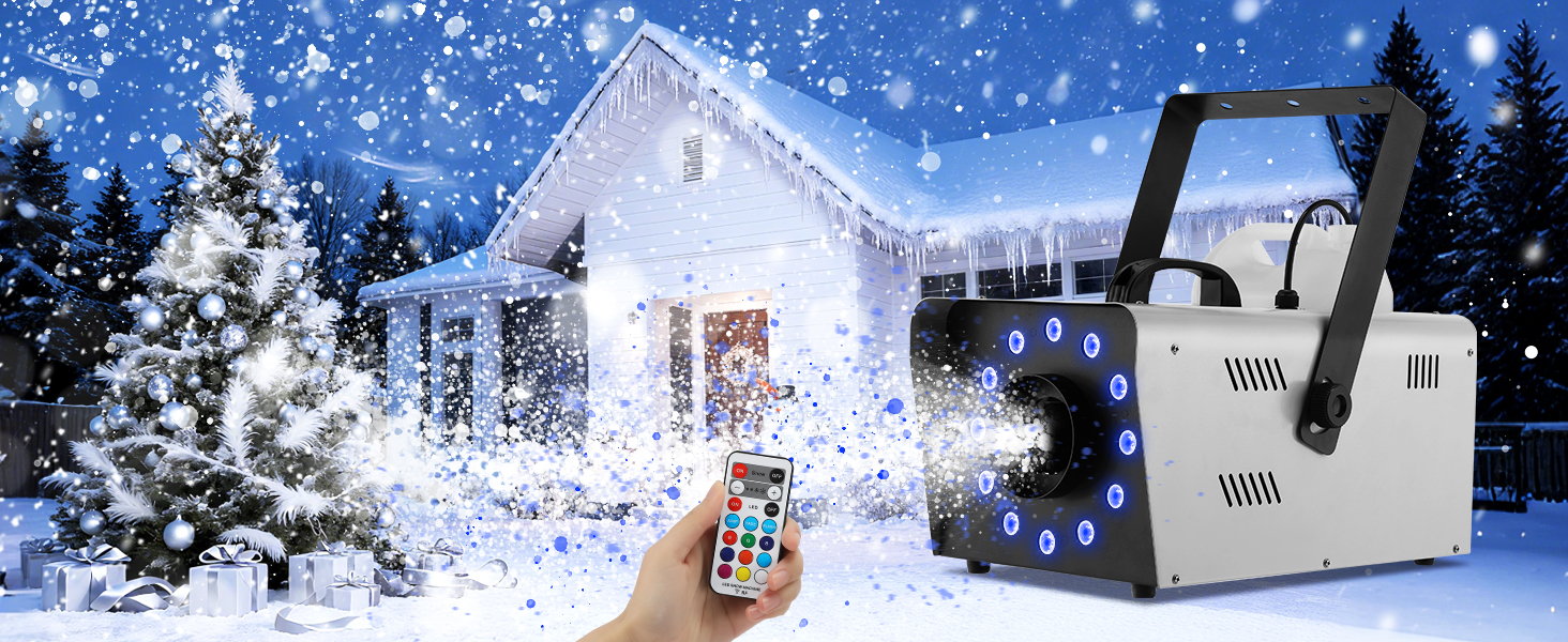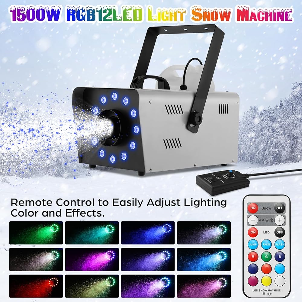 【1500W Snow Machine with Lights】TCFUNDY 1500W Snow machine is equipped with 12 LED Lights, LED lights create 9 colors and 3 light effects, it produces long distance and wide coverage of snow, it comes with a large capacity of tank, making the snow more long lasting.