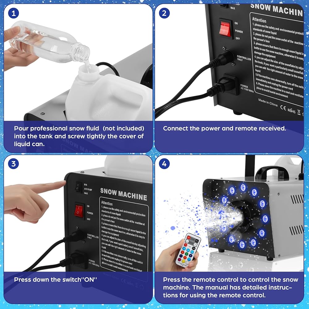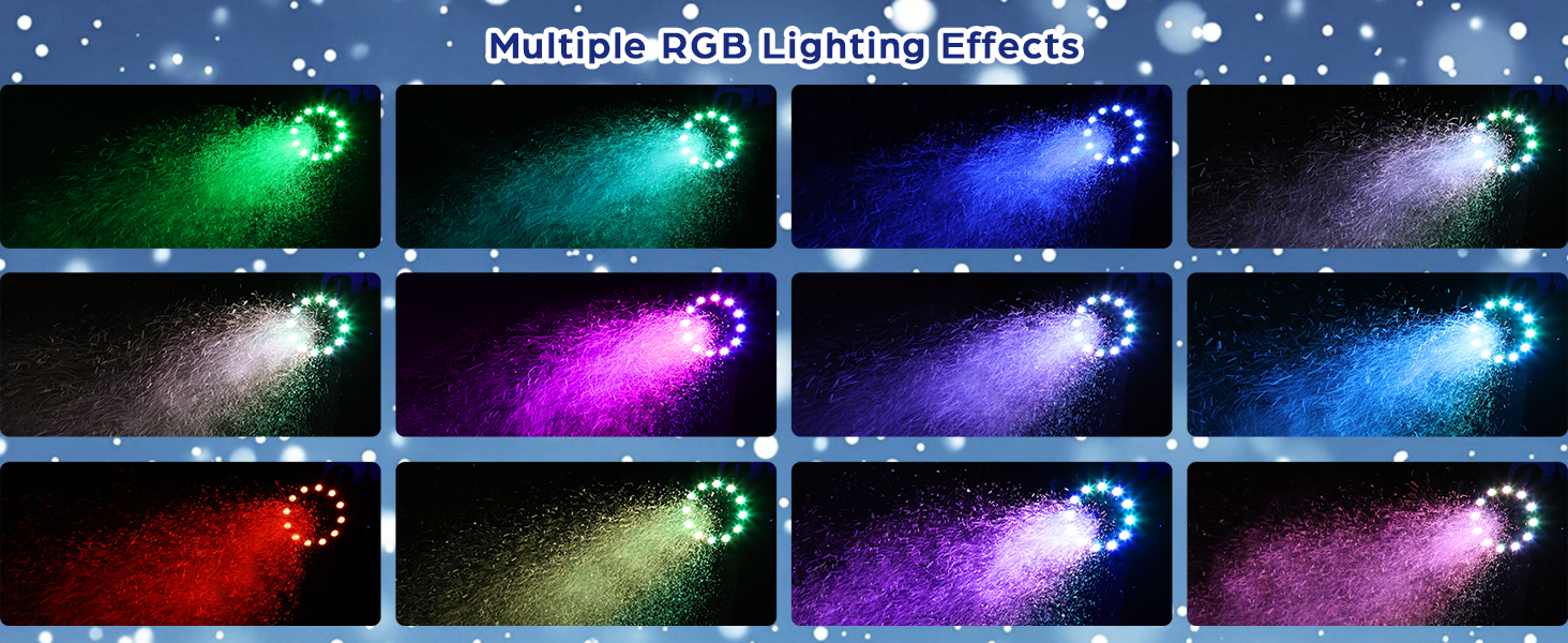 【9 Colors with 3 Light Effect】TCFUNDY snow machine combines 12 LED lights and snow to create 9 colors and 3 light effects by using a remote control. The snow reflects the lights, and the lights change the snow colors. It is perfect for Christmas or enhancing your stage shows.