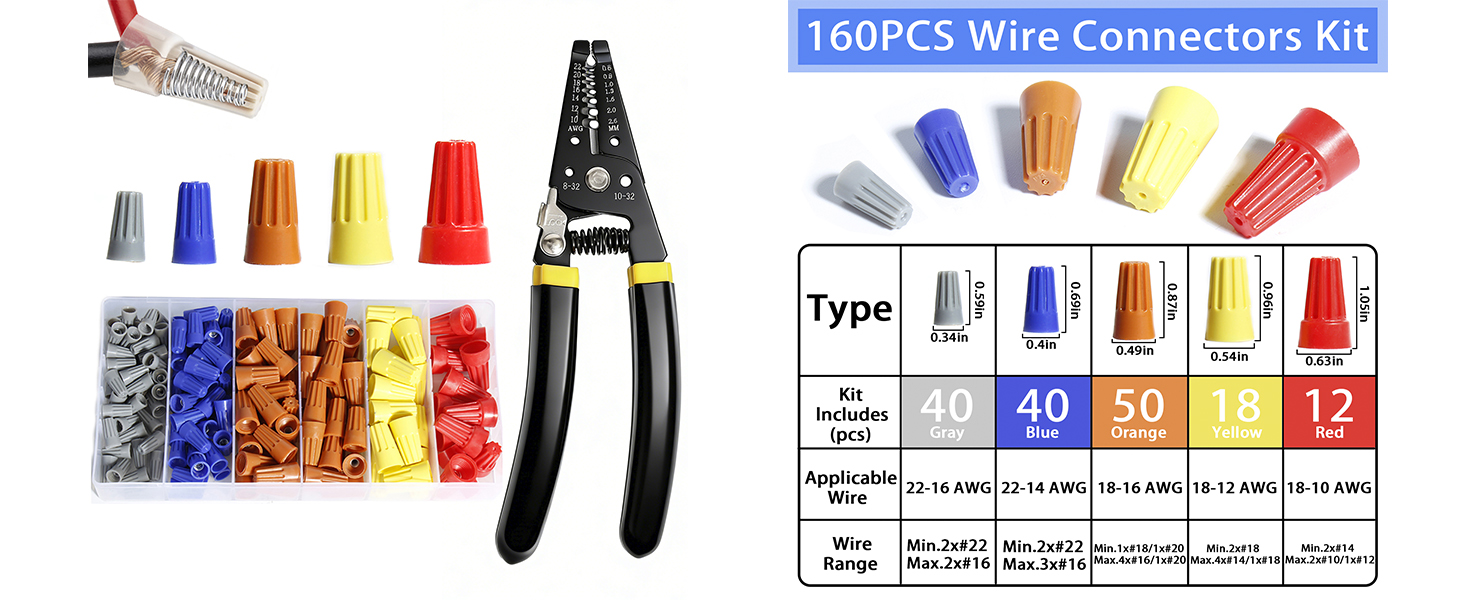 40pcs Grey, 40pcs Blue, 50pcs Orange, 18pcs Yellow, 12pcs Red. The most common size can be used for everyday electrical wiring projects and applications.