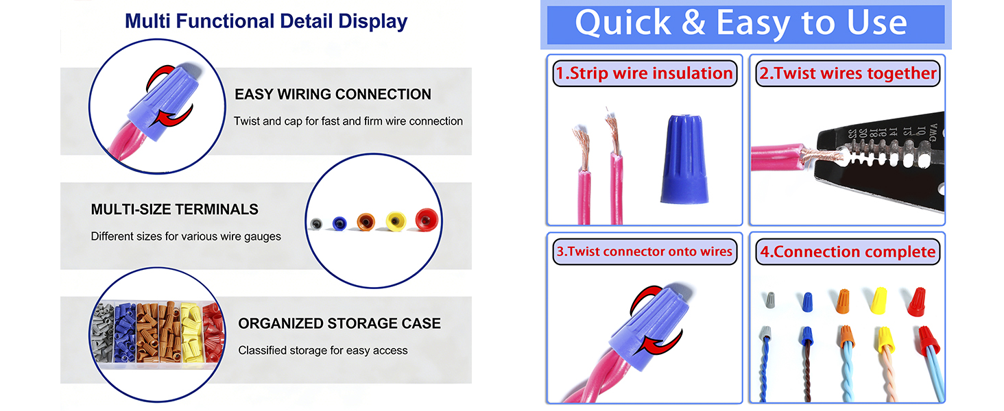INSULATION MATERIAL: These electrical wire connectors are made of plastic shell. The nylon shaped shell has thick wall, high hardness and is not easy to aging. It can effectively prevent the unstable connection of leakage box and enhance the safety and insulation.