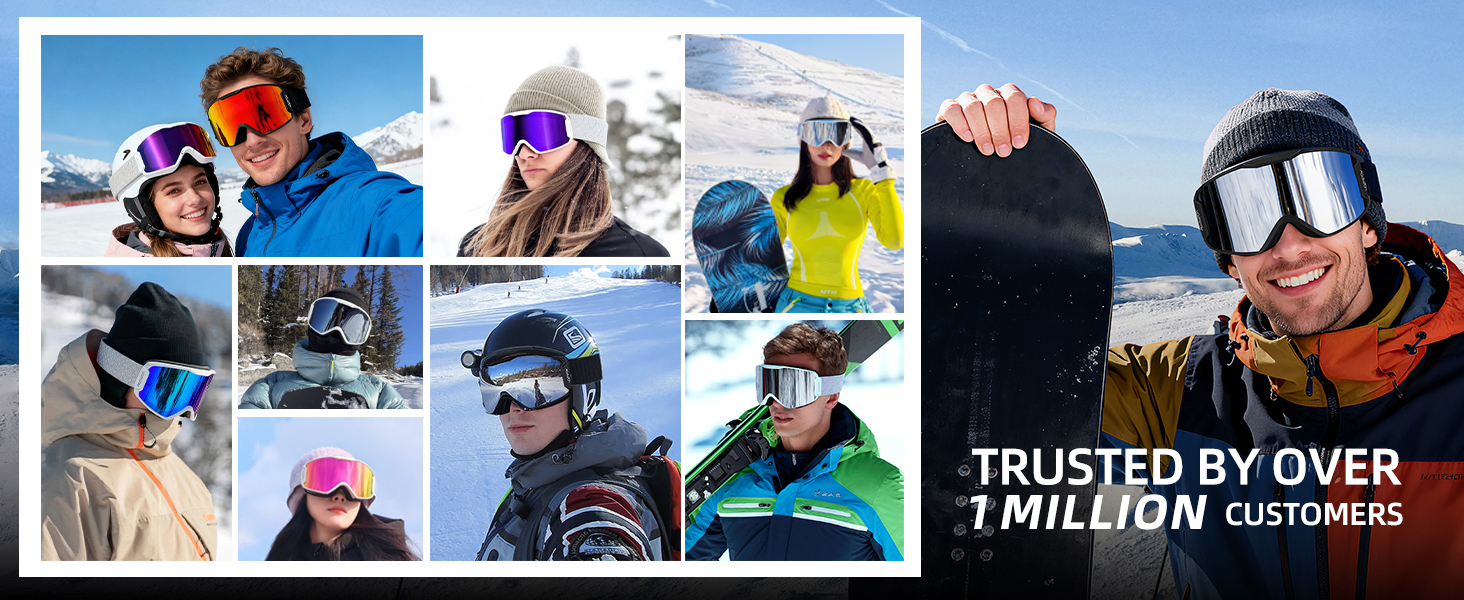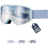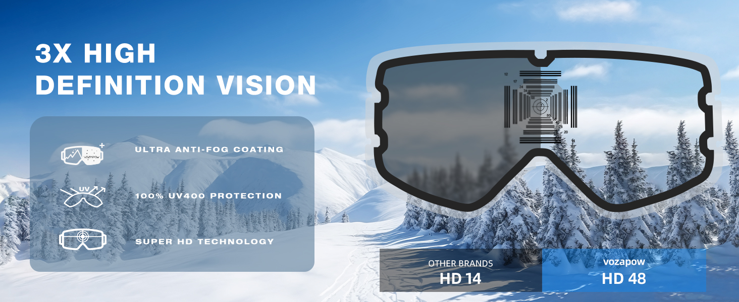 VOZAPOW Ski Goggles deliver high-definition vision, superior comfort, and reliable protection. Featuring a double-layer PC lens with advanced German technology, these goggles block 99.9% UVA/UVB rays, reduce glare, and nearly triple image accuracy compared to standard lenses—ensuring a crystal-clear view of the slopes.
