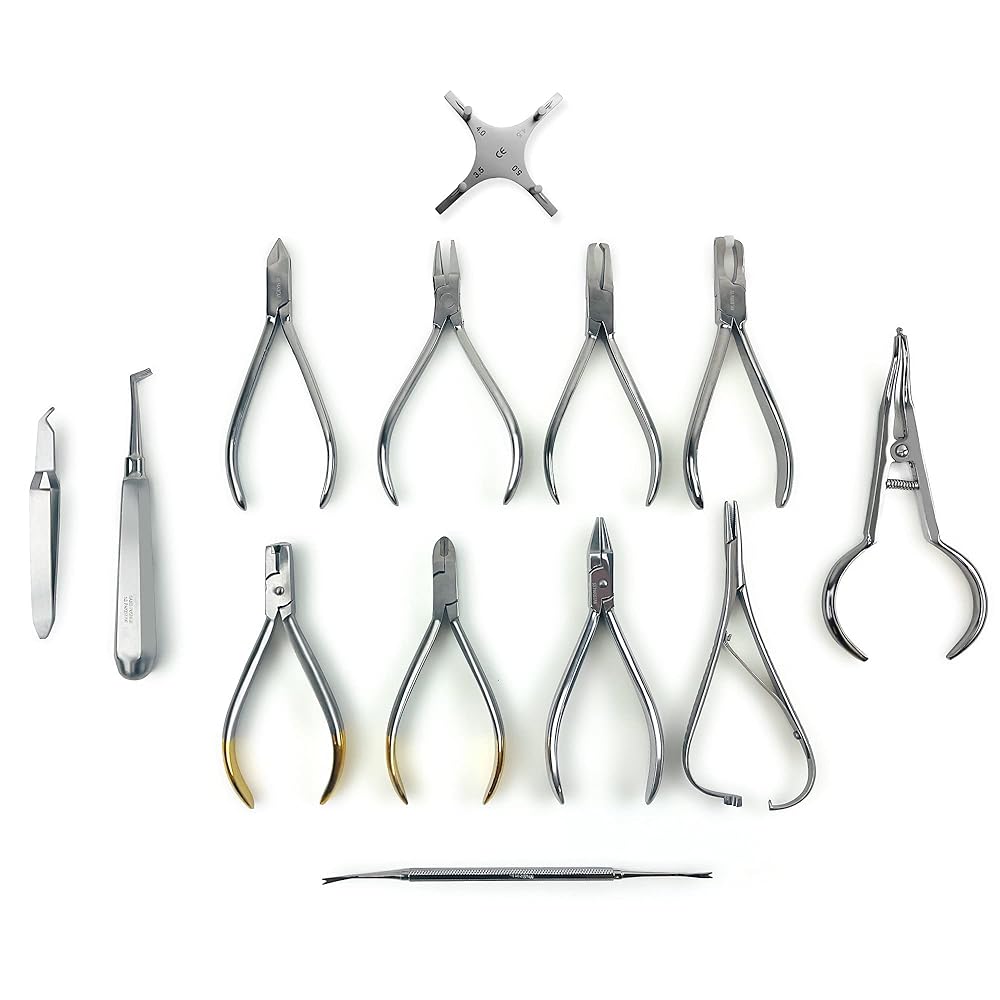 One of each Bird Beak Pliers, Three Prong Bending Aderer Pliers, Hard Wire Cutter, Ligature Director, Light Wire Cutter, Distal End Cutter Safety Hold, Bracket Holder Tweezers, Boone Gauge, Band Pusher, S Band Remover Pliers, Mathieu Pliers, Bracket Remover Pliers, Separating Placing Pliers