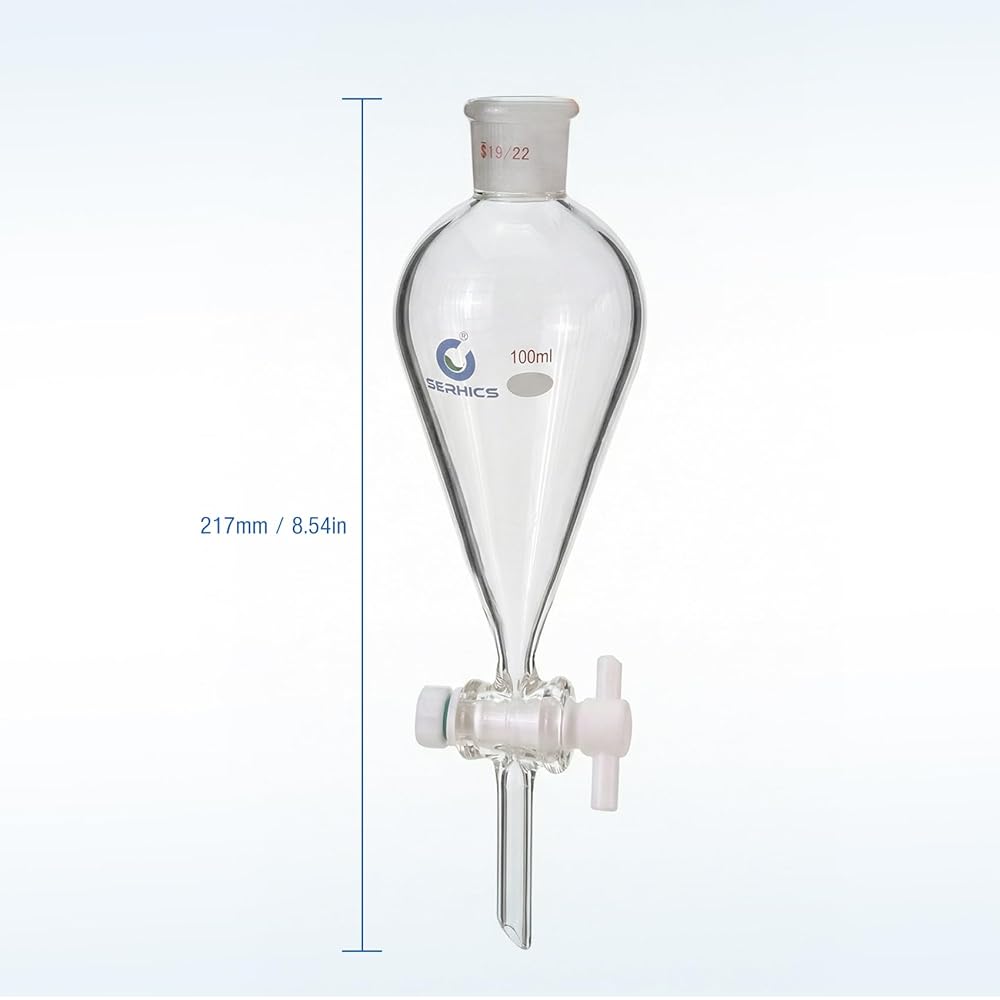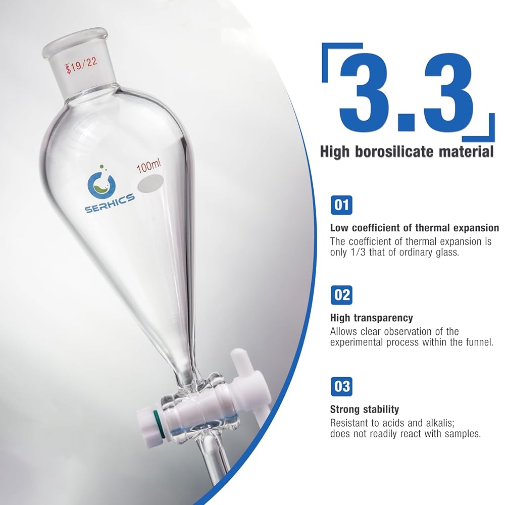 A separating funnel takes the shape of a cone with a hemispherical end. It has a stopper at the top and stopcock (tap), at the bottom. Separating funnels made from borosilicate glass and their taps are made from PTFE