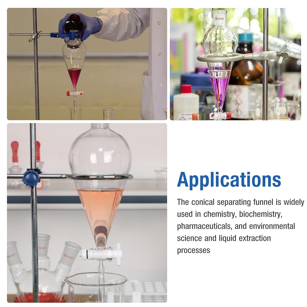 Applications:The conical separating funnel is widely used in chemistry, biochemistry, pharmaceuticals, and environmental science and liquid extraction processes