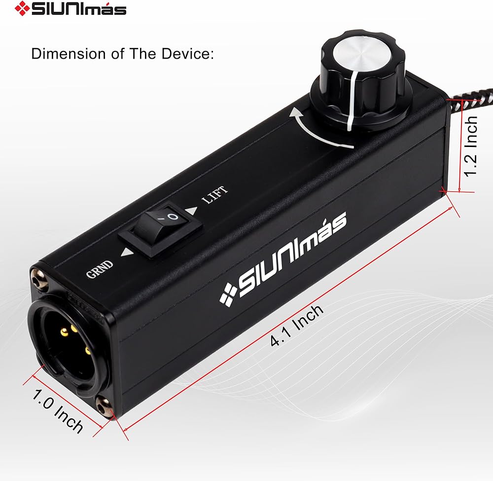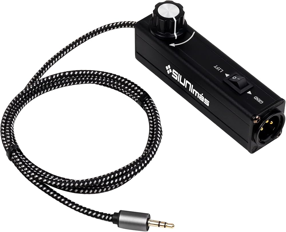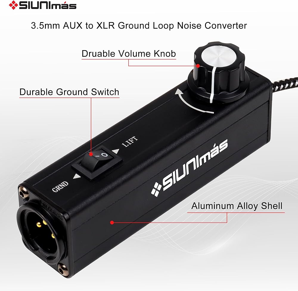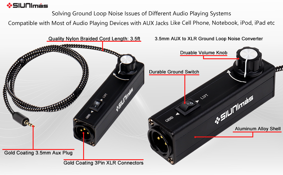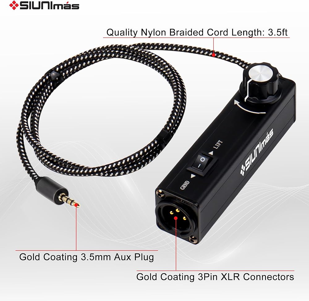 1. SIUNIMAS Pro 01A AUX to XLR 3Pin noise isolation direct box with volume controller and grounding switch build-in nylon braided cord length 3.5ft quality durable 3.5mm AUX plug perfectly for trying in any cell phone, ipad, computer, ipod, MP3, laptop, notebook etc.