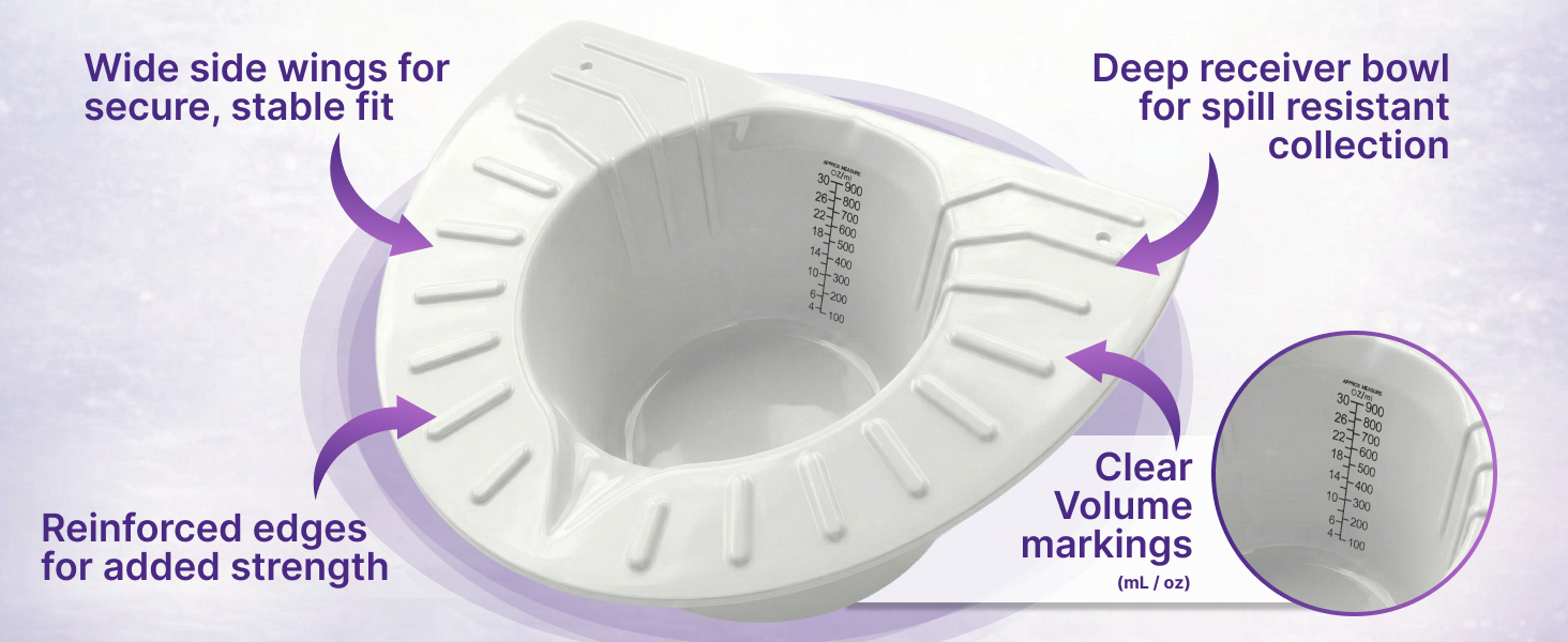 Graduated Markings – Each urine collection hat features easy-to-read measurements in ounces (30oz) and milliliters (900mL) for accurate specimen tracking and output monitoring.