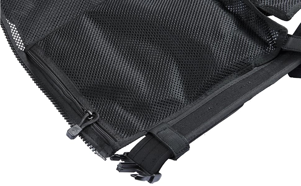- Three lines of MOLLE Webbing in the back of the vest to attach additional pouches, bags as well as a carrying / drag handle which can be used when in emergency. Additional pouches can also be placed on the included pistol belt which houses two small removable general use pouches.