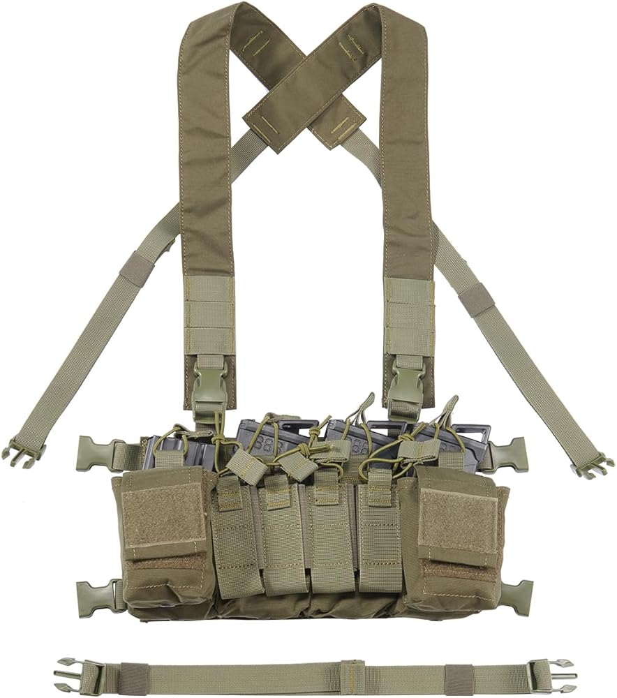 - Four fixed front pockets for magazines (each can hold two airsoft AK/AR magazines )