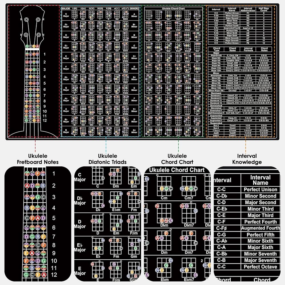 Practice-Focused Design: Maps G-C-E-A fingerboard notes + 12-fret positions, paired with clear chord diagrams (Major/Minor/7ths/9ths) to streamline practice sessions.
