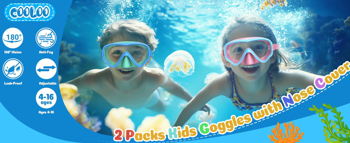 【Anti-Fog & UV Protection】COOLOO kids swimming goggles are equipped with UV400 protective lenses, offering enhanced eye protection against harmful rays. The lenses of our kids' scuba mask feature an anti-fog coating that effectively prevents fogging, allowing children to explore the ocean world more clearly and enjoy the wonderful marine life.