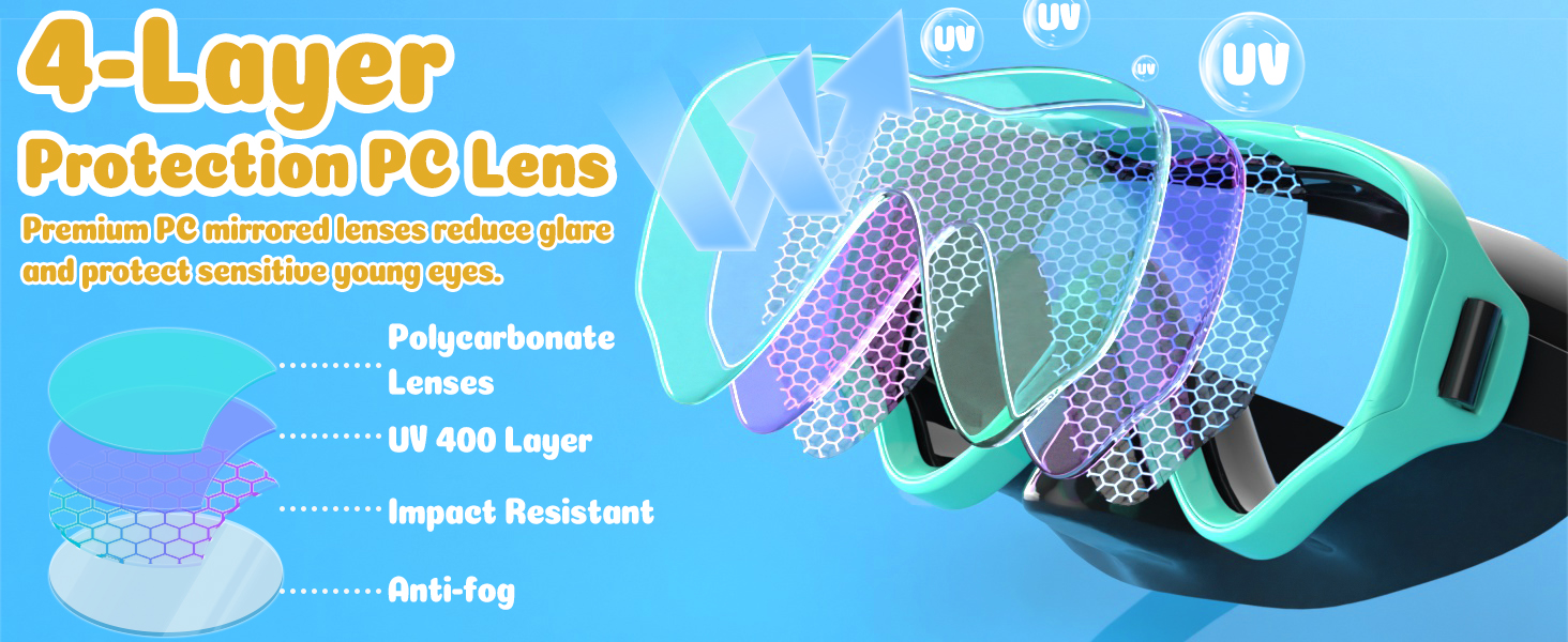 【Ultra-Safe & Lightweight PC Lens】Kids swim goggles features shatterproof PC lenses that are more lightweigh, durable, and Anti-Shattered than tempered glass, effectively reducing the risk of dangerous cracks or sharp fragments. The 180° wide field of view provides a crystal-clear, undistorted underwater perspective, allowing children to fully immerse in and explore the aquatic world.