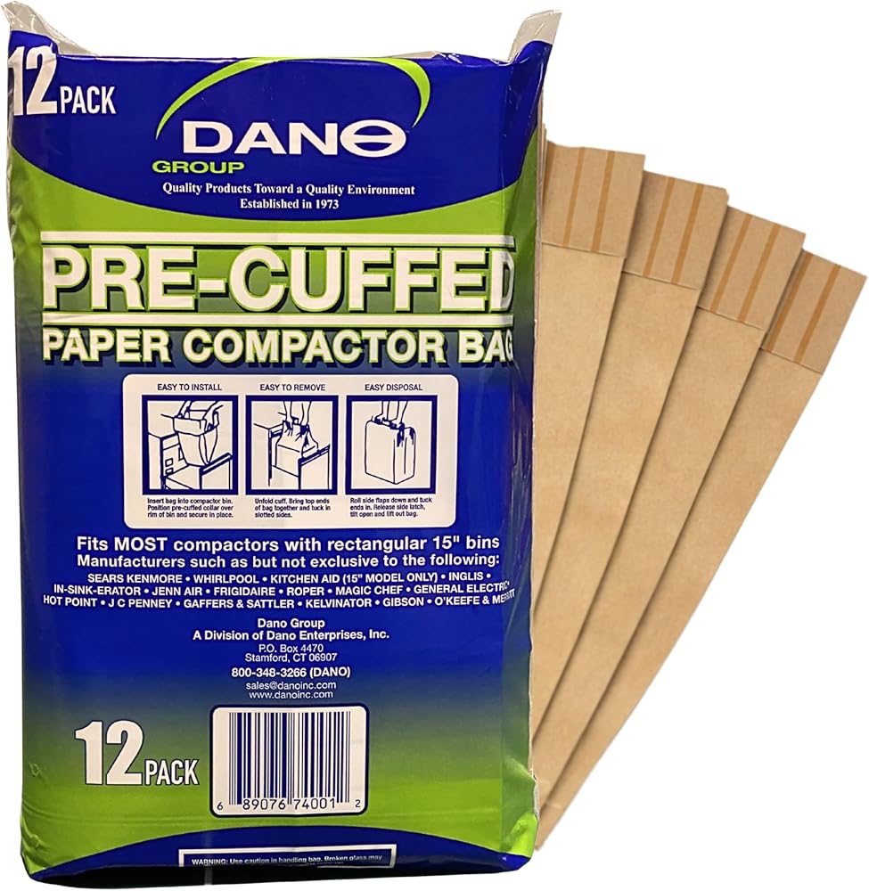 Dano Pre-Cuffed Paper Trash Compactor Bags (12 Pack) | Heavy Duty Kitchen Garbage Compactor Bags & Liners | 11 Gallon Precuffed Garbage Bag for Compactor | Eco-Friendly Trash Compactor Bag