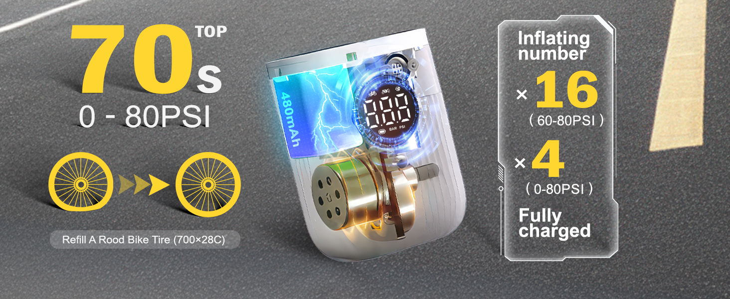 【Compact & Lightweight】Measuring just 2.95 x 2.36 x 1.34 inches and weighing 5.3 oz, this mini electric pump is smaller than a phone and fits easily in your pocket, saddle bag, or backpack. Its compact shape makes it perfect for daily commutes, long rides, or emergency roadside inflation. No bulky equipment – just grab and go.
