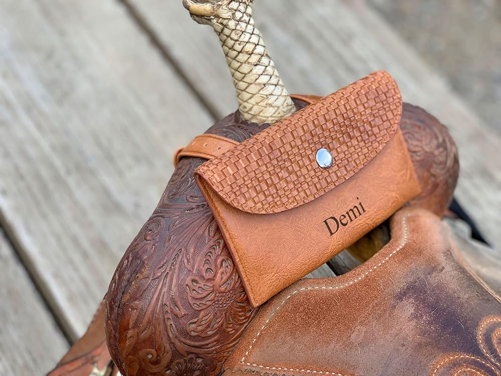 Easily Access. This durable hand-made saddle bag for horses while focusing on riding, perfectly sized for small items such as any size cell phone, sunglasses, entry fees, hoof pick, chap stick, keys, money and more.