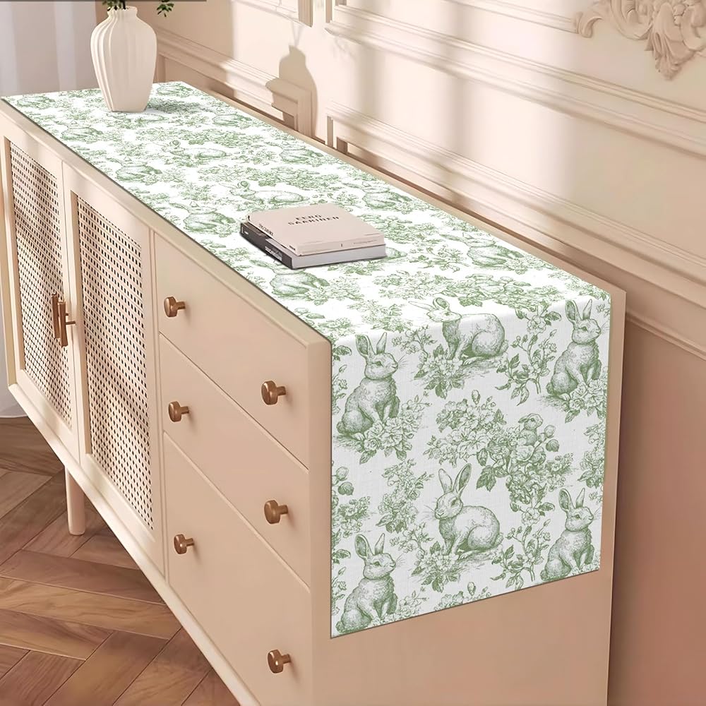 Chinoiserie Easter Table Runner Toile de Jouy Vintage Green and White Bunny Spring Party Decoration Home Kitchen Dining Room Table Decor (Green, 13" x 72")