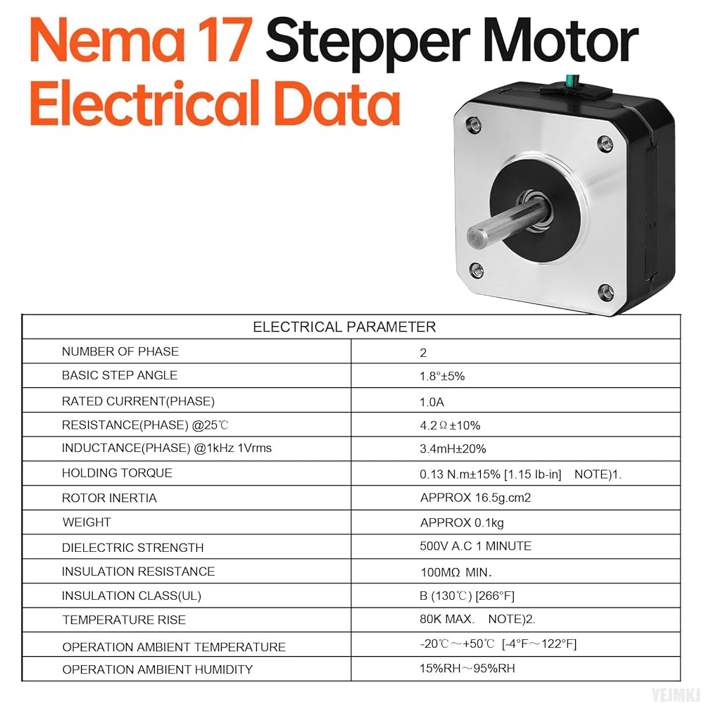 Operational Safety: Operating safely and reliably, this Nema 17 Step motor comes with the following key safety parameters. Dielectric strength 500V A.C 1 MINUTE; Insulation resistance 100MΩ MIN; Operation ambient temperature -20℃ ~+50℃ [-4°F~122°F]; Operation ambient humidity 15%RH~95%RH; Insulation class(UL) B (130℃) [266°F]; Temperature rise 80K MAX.