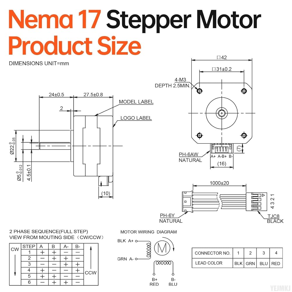 Specifications: Nema 17 Stepper Motor has the following various dimensional parameters. Body size 42x42x27.5mm, (1.66x1.66x1.09in), Installation hole distance 31mm, Shaft length 24±0.5mm, Shaft diameter φ5mm, D-cut length 24mm, with Cable 1m, 4-Wire Black (A+) Green (A-) Red (B+) Blue (B-), Weight 190g.
