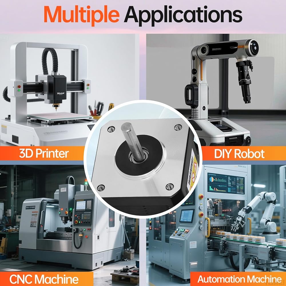 Important Considerations: Higher speeds lead to a decrease in torque, with operation recommended at 0–600 RPM. Reducing current lowers both torque and temperature rise, while lower voltage reduces torque (12–24V DC range). The 42mm Stepper Motor is used in various applications like 3D printers, DIY robots, and CNC machines, offering a compact design and high torque for demanding tasks.