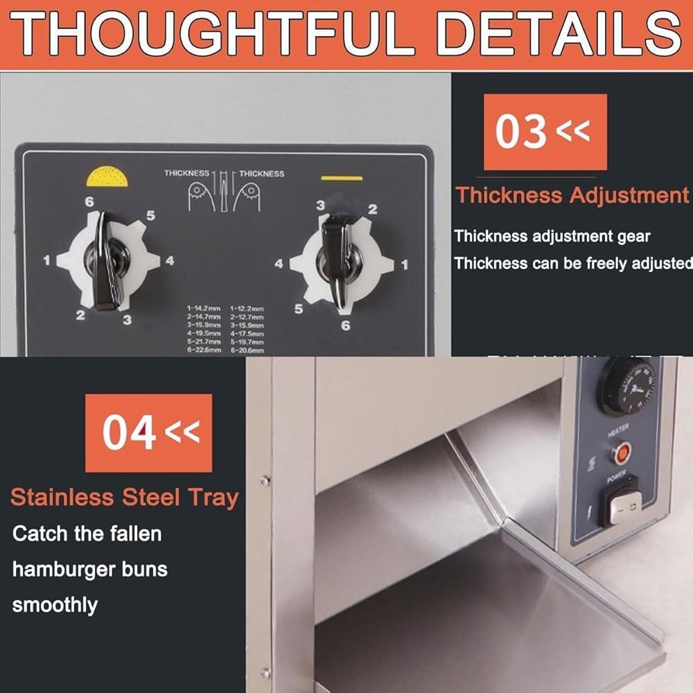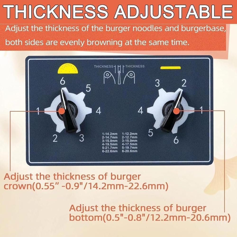 【Easy to operate】Burger thickness and heating temperature can be adjusted, which make it suitable for heating a variety of food, such as bread, fro-zen waffles, burgers, etc.