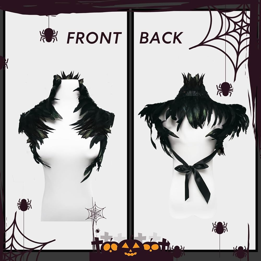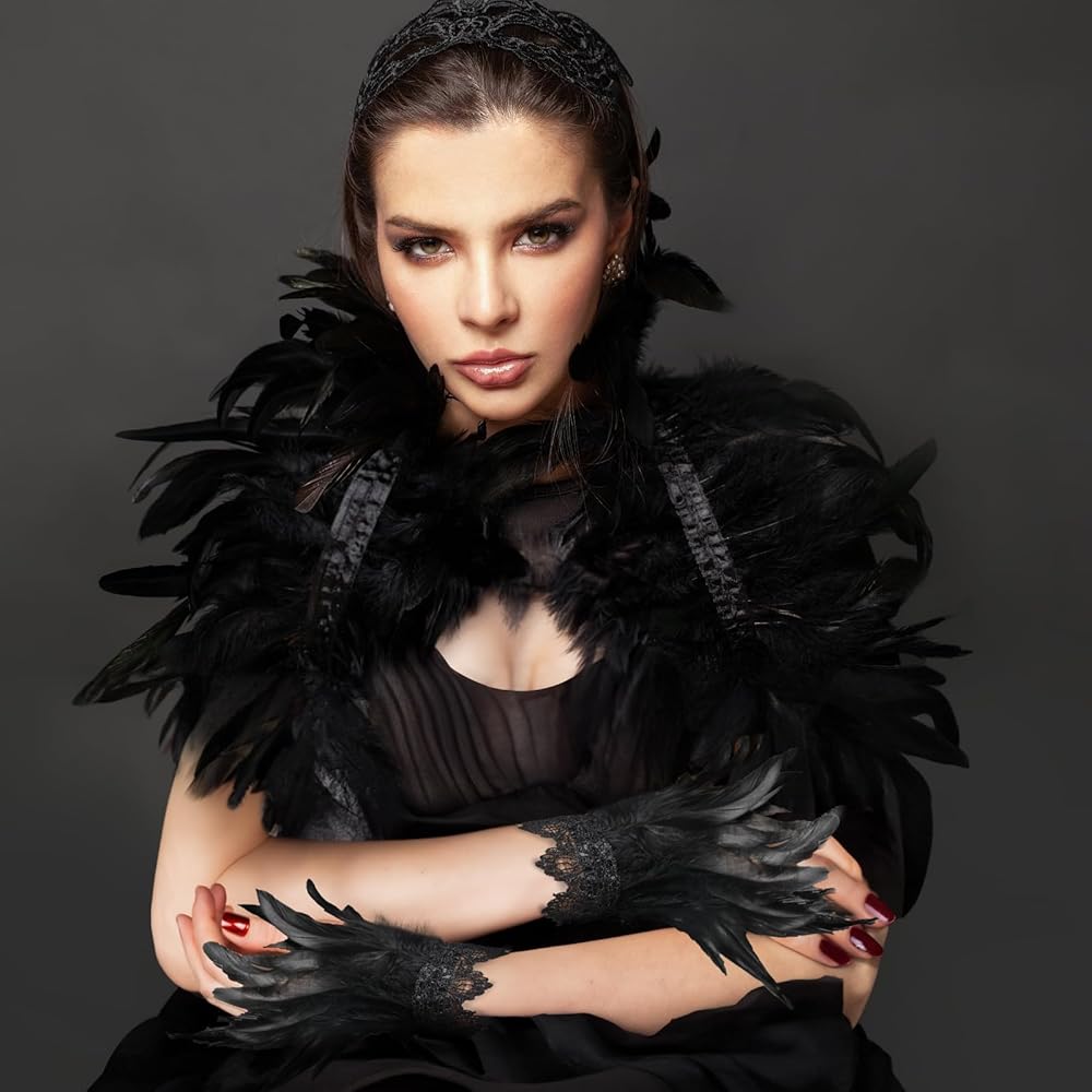 Package includes: a black natural feather shawl + a pair of black natural feather wristbands
