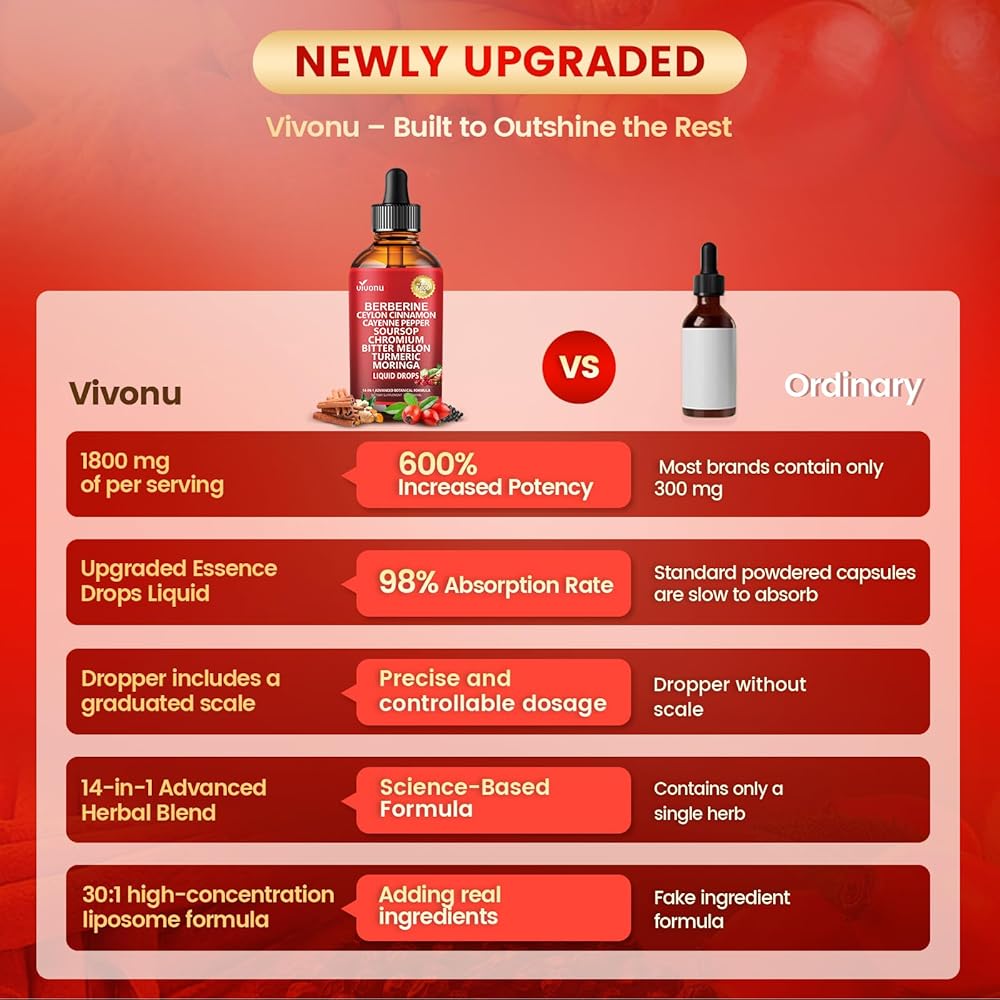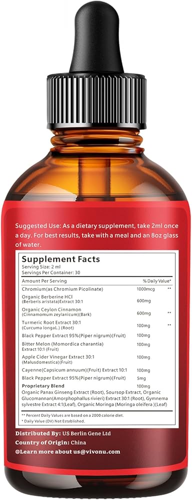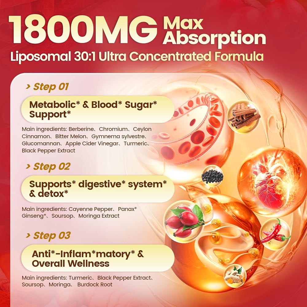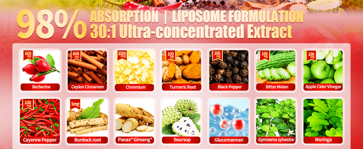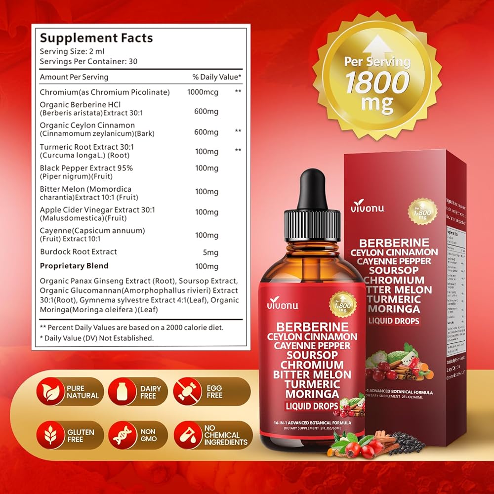 مركب عشبي 14 في 1: كل جرعة توفر 1800 مجم من المستخلص النشط، بما في ذلك البربارين العضوي، قرفة سيلان العضوية، الكركم، البطيخ المر، الفلفل الحار، خل التفاح، الفلفل الأسود، بالإضافة إلى قشطة شائكة، جلوكومانان، جيمنيما سيلفستر، مورينجا - مركب البربارين.