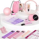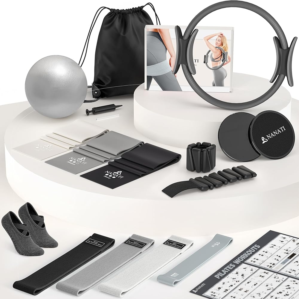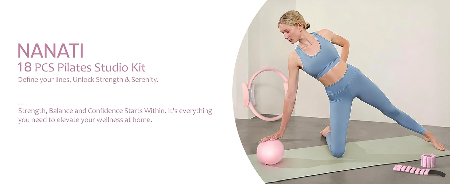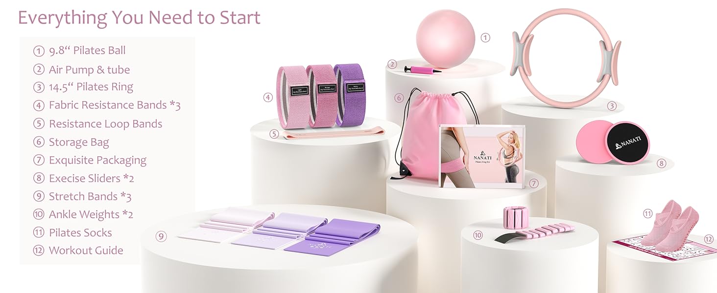 Complete 18-in-1 Home Pilates Studio: NANATI Pilates set delivers a true all-in-one home fitness experience. It includes 14.5" Pilates ring, 9.8" yoga ball (with air pump), 2 adjustable ankle/wrist weights(1 lb each), 2 core sliders, 4 loop resistance bands(15 lbs/30 lbs/60 lbs/90 lbs), 3 long elastic bands(Light/Medium/Heavy), grip socks, detailed workout guide and an convenient storage bag. Start your journey with this pink Pilates kit