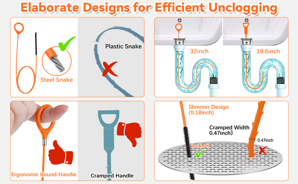【Upgraded 32inch Anti-break Steel Rope Drain Snake】Snake drain hair removal tools are made from steel cables coated with a layer of nylon. Embedded steel cables ensure superior strength, capable of withstanding over 300 lbs of pulling force, no need to worry about snapping in the drain pipe. The nylon layer enhances flexibility, allowing it to bend super easily into different angles, allowing it to pass smoothly through the L/P/U/S Pipe Cleaners