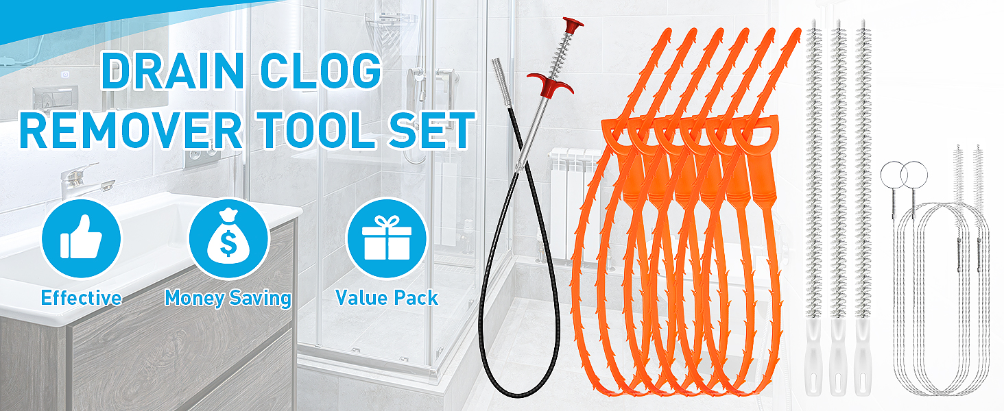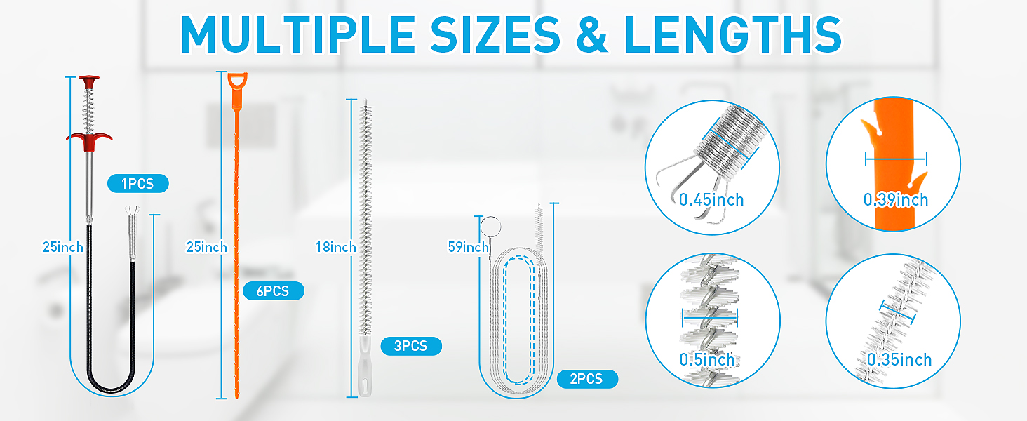 12-in-1 complete drain clog remover tool kit: 1 × 25inch stainless steel grabber sink drain clog remover with a claw to retrieve hair and debris deep inside pipes; 6 × 25inch durable plastic orange drain snake hair drain clog remover for fast hair removal in bathroom sinks and bathtubs. 2 × 59-inch long flexible cleaning brushes—perfect for cleaning narrow pipes like refrigerator drains and reusable straws; 3 × 18-inch pipe brushes—ideal for regular drain maintenance, helping prevent odors, insect breeding, and improve water flow; All-in-one, eco-friendly, and reusable—this sink drain cleaner saves you time, money, and the need for harsh chemicals or a plumber.