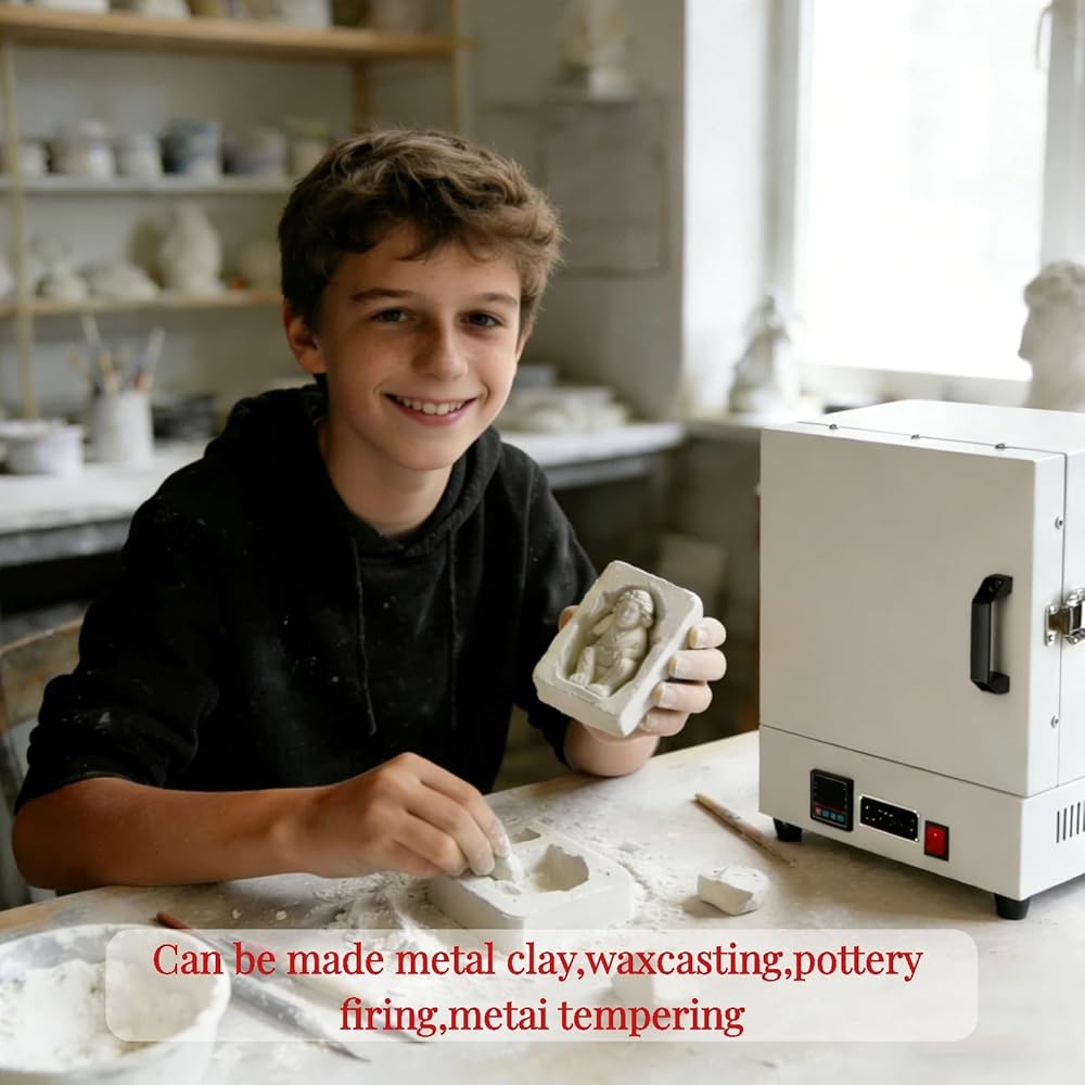 Introducing our Electric Kiln Furnace, designed for both amateur and professional artists seeking high-quality results in their creative projects. With its innovative four-sided surround heating technology, this electric kiln ensures even heat distribution, making it ideal for pottery, glass fusing, and other crafting activities. Experience precise temperature control with a range of 0 to 1150 ℃, complemented by a smart display that simplifies monitoring your firing processes. The 2000W high power heating elements and robust furnace wire allow for rapid heating, so you can start your projects without unnecessary delays. The sealed door design minimizes heat loss, ensuring efficient operation and consistent results. Measuring 30x27x42cm (11.8x10.6x16.5in) externally and featuring an internal space of 16x16x13.8cm (6.3x6.3x5.4in), this kiln is compact yet spacious enough for various projects. Weighing 15.5kg (34.2lbs) with a gross weight of 18kg (39.6lbs), this kiln is sturdy and portable, making it suitable for home studios or workshops. This electric kiln is perfect for anyone looking to explore their artistic side, whether you're shaping clay or creating stunning glass pieces. With our commitment to quality and customer satisfaction, we are here to support you. If you encounter any issues, please reach out to us, and we promise to respond within 24 hours. Transform your creative vision into reality with our Electric Kiln Furnace, where precision meets performance for all your crafting needs.