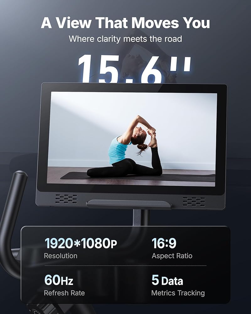 【Immersive 15.6" FHD Rotating Display】 Our recumbent bike features a 15.6 " Full HD (1920×1080) rotating screen that adjusts 90° horizontally and 60° vertically.An ideal stationary bike for home, it allows you to mirror your phone for entertainment while tracking workout metrics, ensuring optimal visibility during intense sessions. **Note: Currently incompatible with iPhone 17 series and Google phones