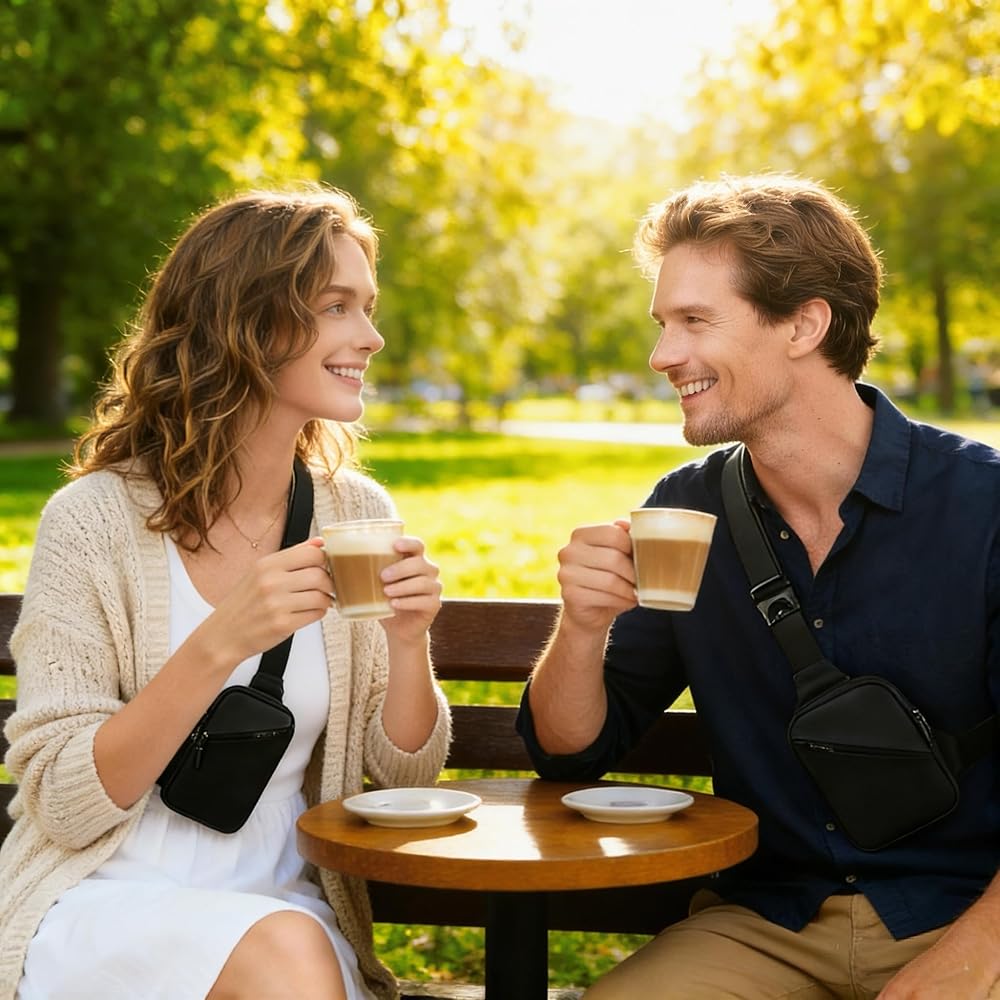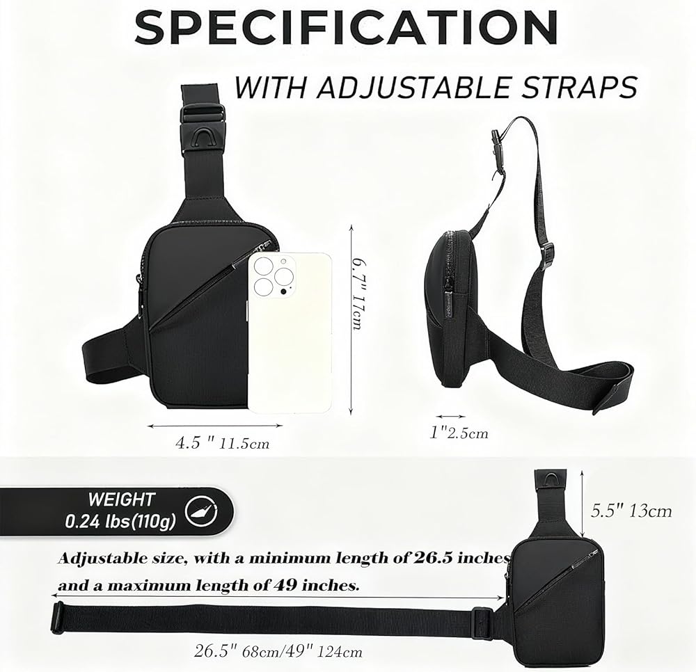 Ultra-Compact & Lightweight, No Bulk Carry Designed for slim, bulk-free wear, this bag measures 4.5"L x6.7"H x1"W and weighs only 3.84oz, fitting close to the body without any awkward bulk. The wide adjustable strap with quick-release buckle ensures all-day comfort for men and women, holding only daily basics.