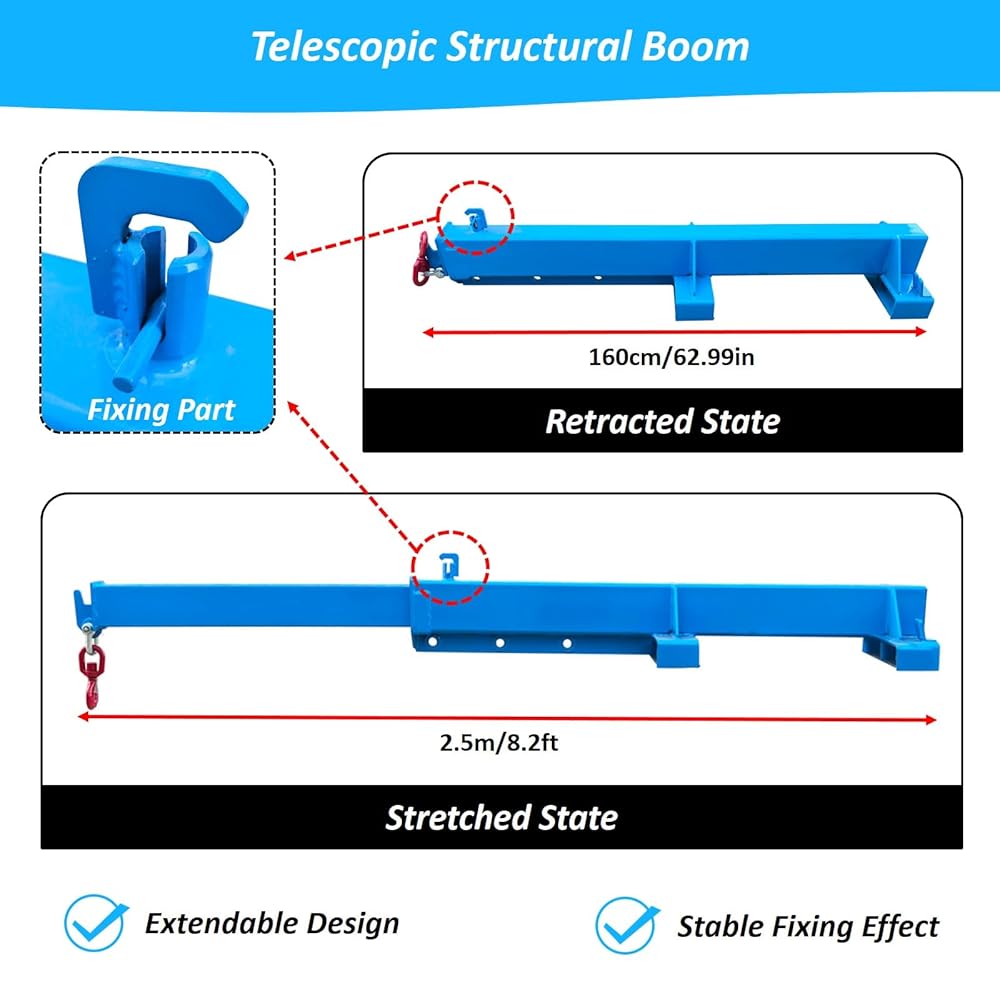 Stable Forklift Boom Attachment: Built with dual 6.3"x2.17" fork pockets and reinforced seamless-welded bases, plus an integrated safety chain that secures the unit to the forklift for enhanced stability during lifting operations.