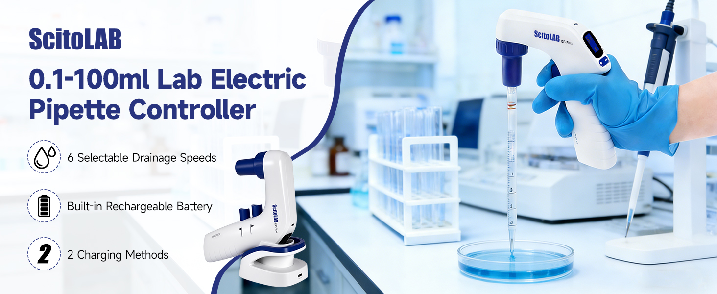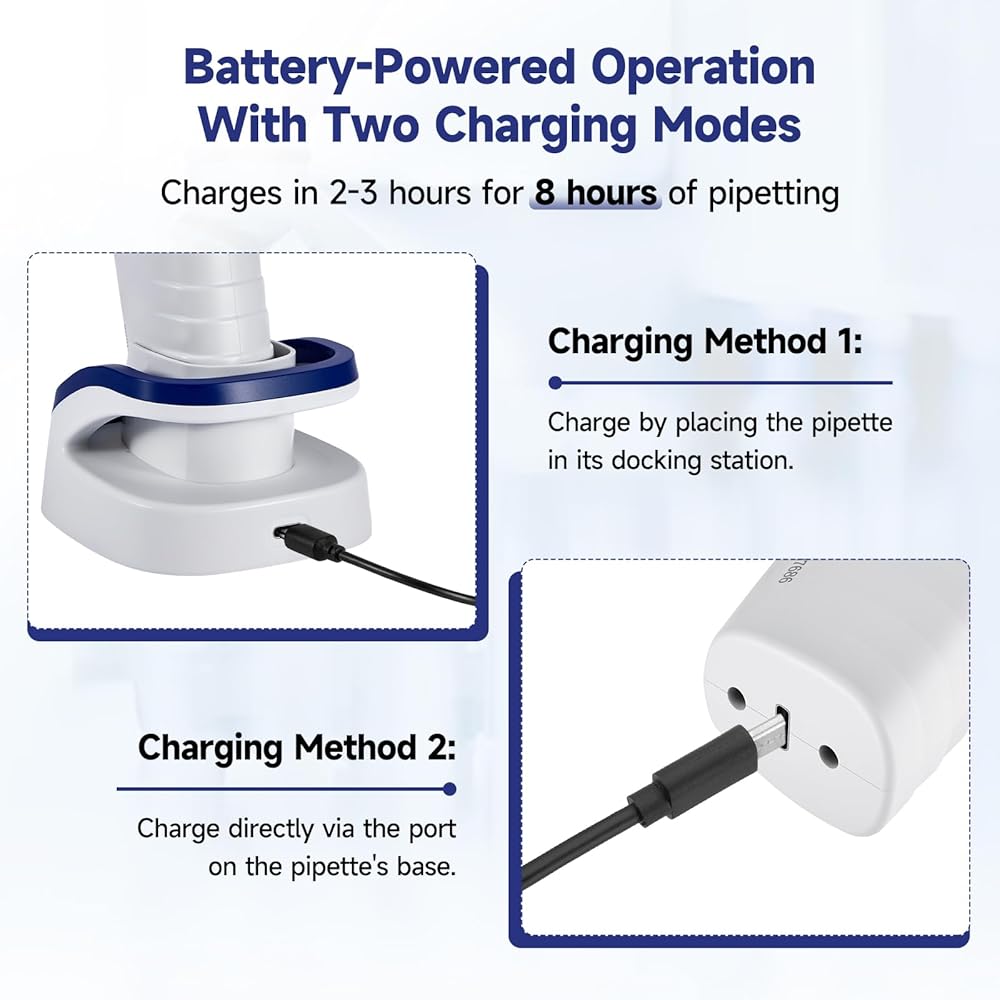 Sustained Power for Uninterrupted Workflows - Motorized pipette powered by a rechargeable battery, it fully recharges in just 2-3 hours, delivering up to 8 hours of continuous pipetting. This ensures reliable, all-day operation for extended experimental procedures