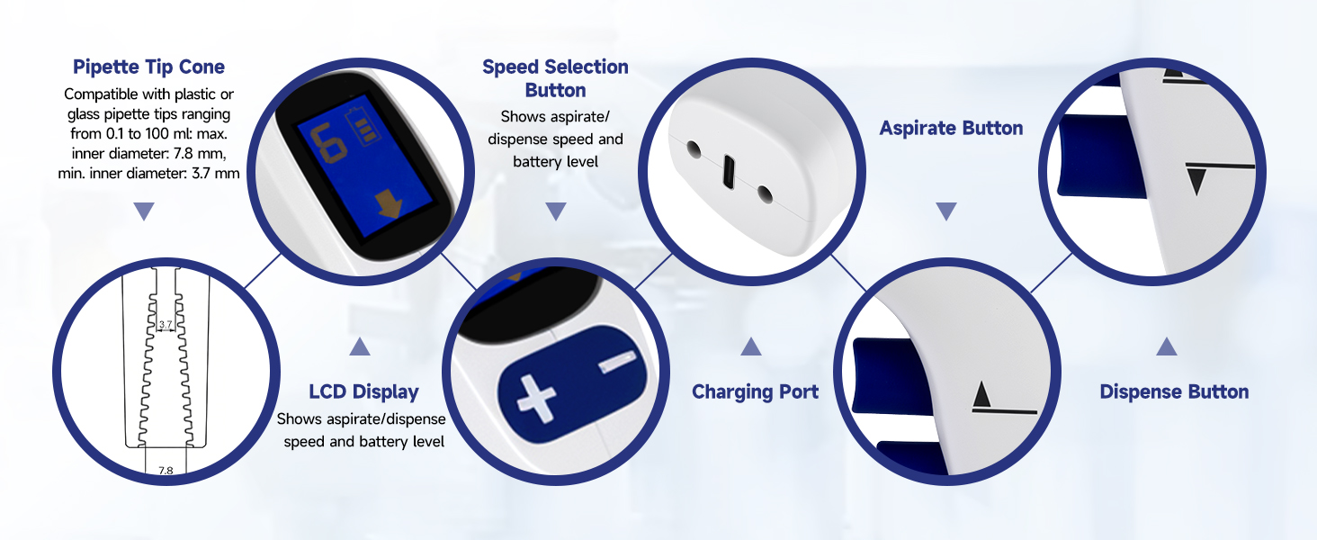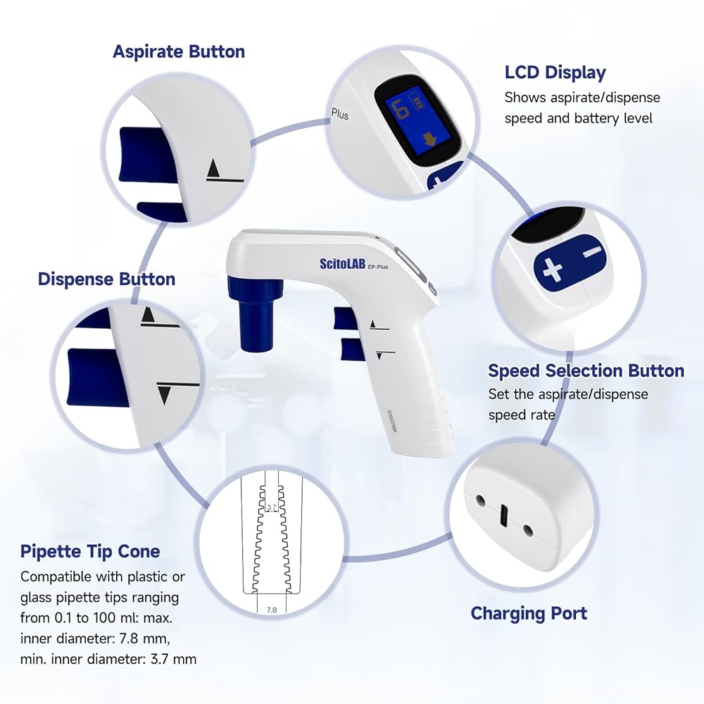 Universal Compatibility for Broad Applications - This electric pipette controller is designed to accommodate most standard plastic and glass pipettes, handling an exceptionally broad volume range from 0.1 mL to 100 mL. It streamlines workflows across diverse protocols, from delicate serial dilutions to larger volume transfers