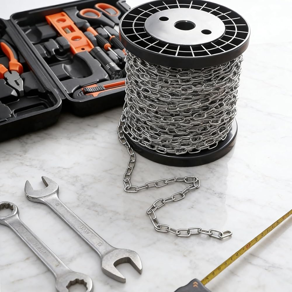 This product is a 50-foot (15-meter) long stainless steel chain with fully welded links, offering both durability and safe load-bearing capacity.