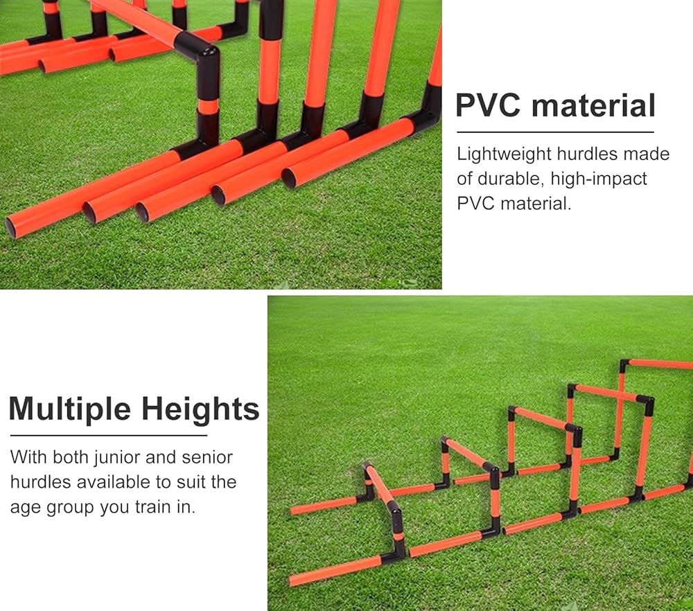 This set of hurdles can withstand the challenge and help you to be a better, faster, and more focused athlete! ?Package List: - 5 x Track and Field Hurdles ?Specification: - Material: PVC - Height: 16cm / 6 1/4", 23cm/ 9", 30cm / 11 3/4", 40cm / 19 3/4", 50cm / 19 3/4" - Width: 28cm / 11inch ?Features: - Simple assembly and disassembly. - These are perfect for all ages hurdlers. - Great for indoor and outdoor training and sports events. - Use the hurdle to improve runners' agility, speed and form. ?Please Note: - Please allow a slight dimension difference due to different manual measurements. - Due to the light and screen setting difference, the item's color may be slightly different from the pictures.