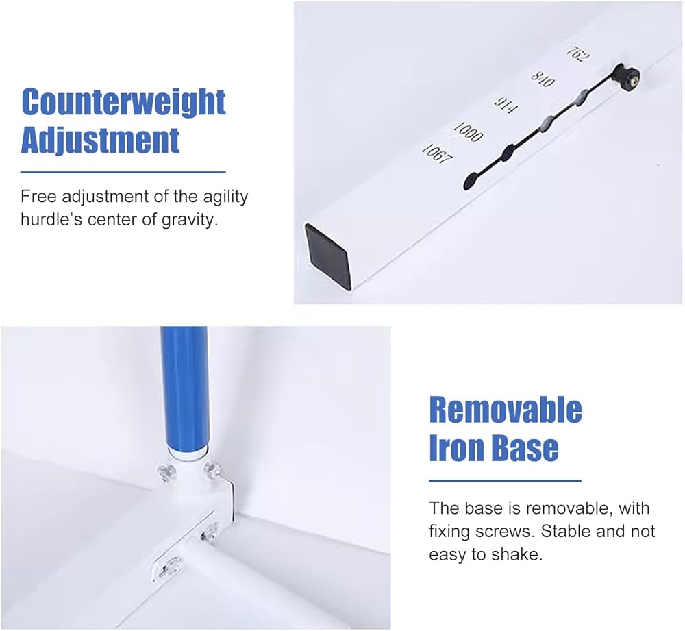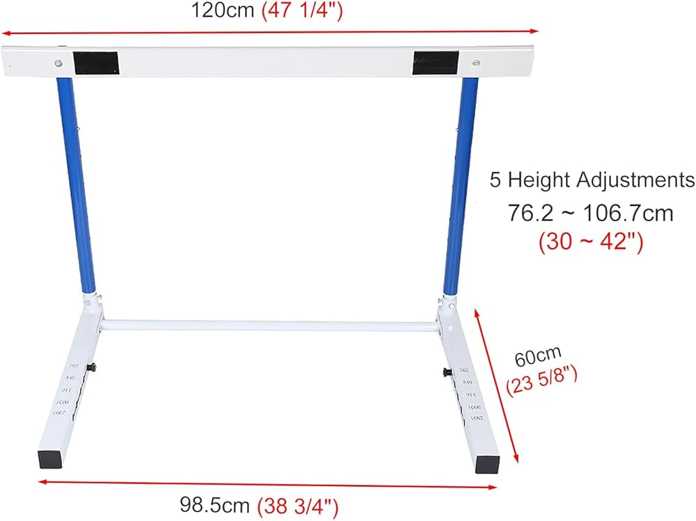 This set of hurdles can withstand the challenge and help you to be a better, faster, and more focused athlete! ?Package List: - 1 x Track and Field Hurdle ?Specification: - Material: Metal - Color: White & Blue - Adjust: 5 Height Adjustable ?Features: - Simple assembly and disassembly. - These are perfect for all ages hurdlers. - Can change hurdle heights in a moment. - Great for indoor and outdoor training and sports events. - durable metal, sturdy and built to last, season after season. - Use the hurdle to improve runners' agility, speed and form. ?Please Note: - Please allow a slight dimension difference due to different manual measurements. - Due to the light and screen setting difference, the item's color may be slightly different from the pictures.