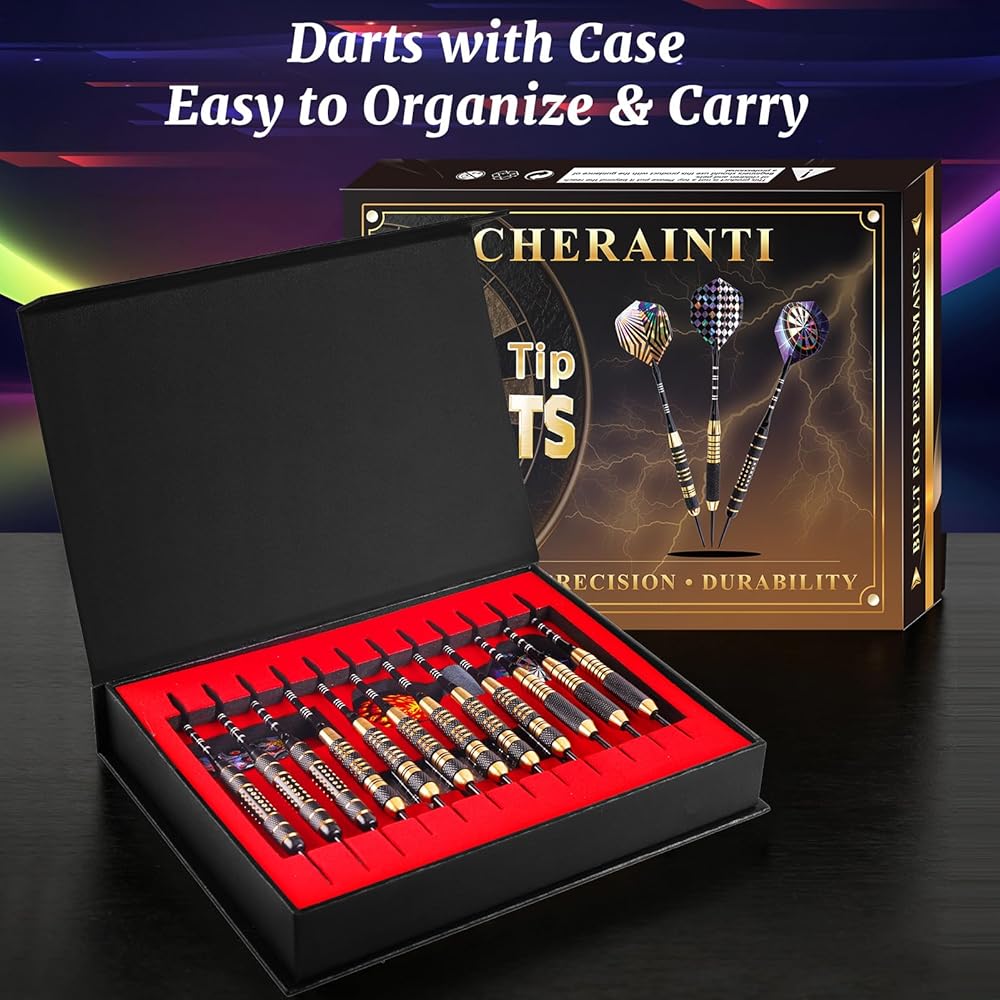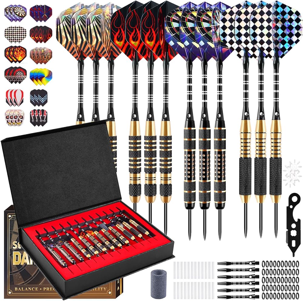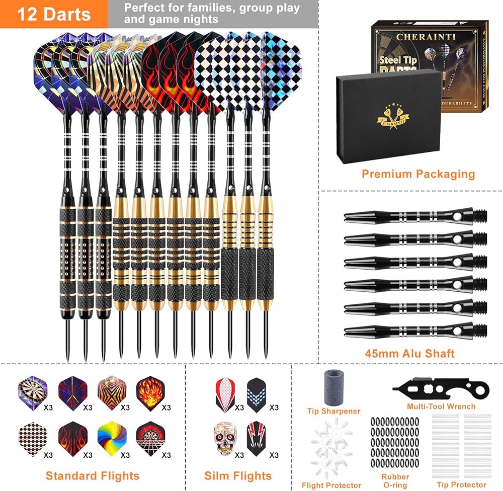 CHERAINTI Darts Metal Tip Set, 12 PCS Professional Steel Tip Darts for Dartboard with 20g 22g 24g Brass Barrels, 18 Aluminum Shafts, 36 Flights, 50 Rubber O-Rings, Sharpener Tool Kit and Gift Box