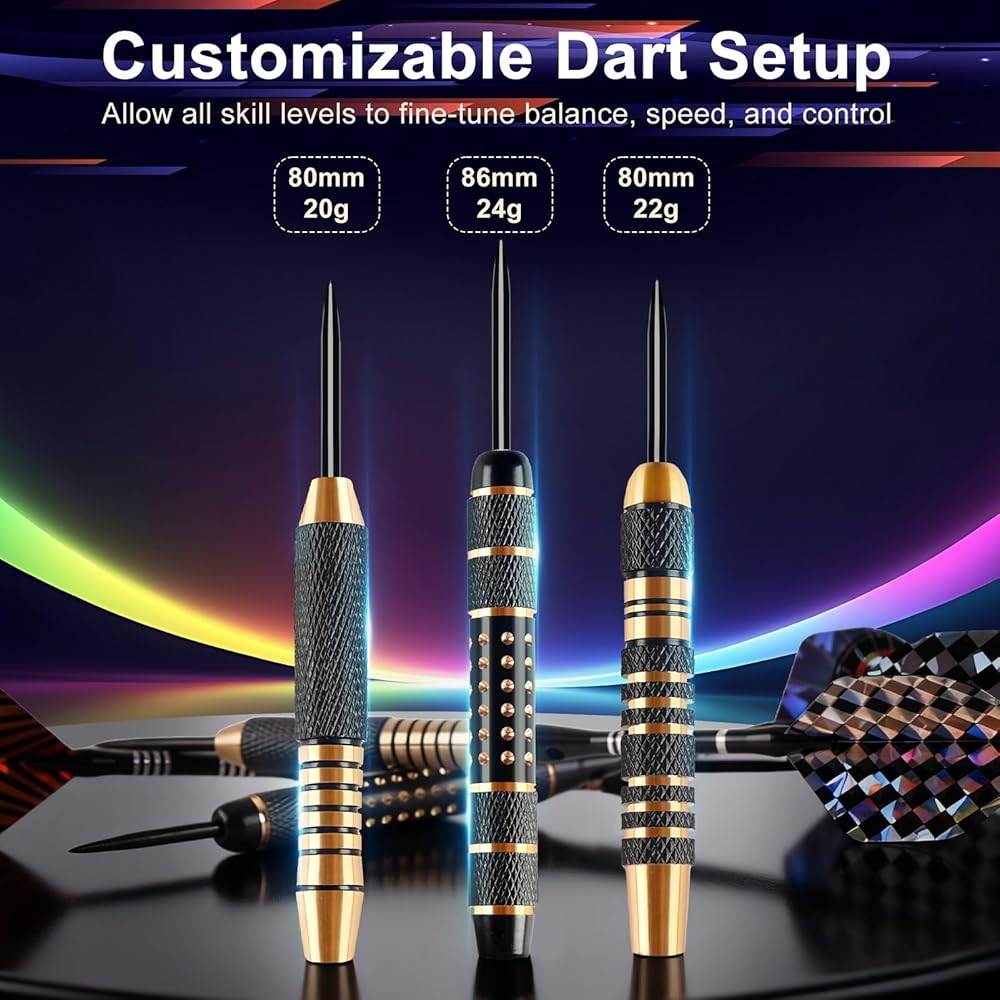 Customizable Dart Setup: The professional darts set includes 12 brass barrels (20g/22g/24g), 18 aluminum shafts (45mm & 48mm), 36 PVC flights (standard & slim); Allowing you to fine-tune balance, control, and flight to match your personal throwing style