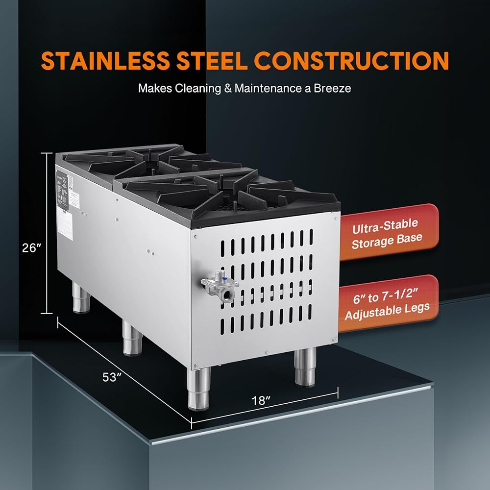 WILPREP Commercial Gas Stove, 2 Burner with Total 160000 BTU, 53" Propane Range with Natural Conversion Kit Grates, Stainless Steel for Restaurant Kitchen, silver