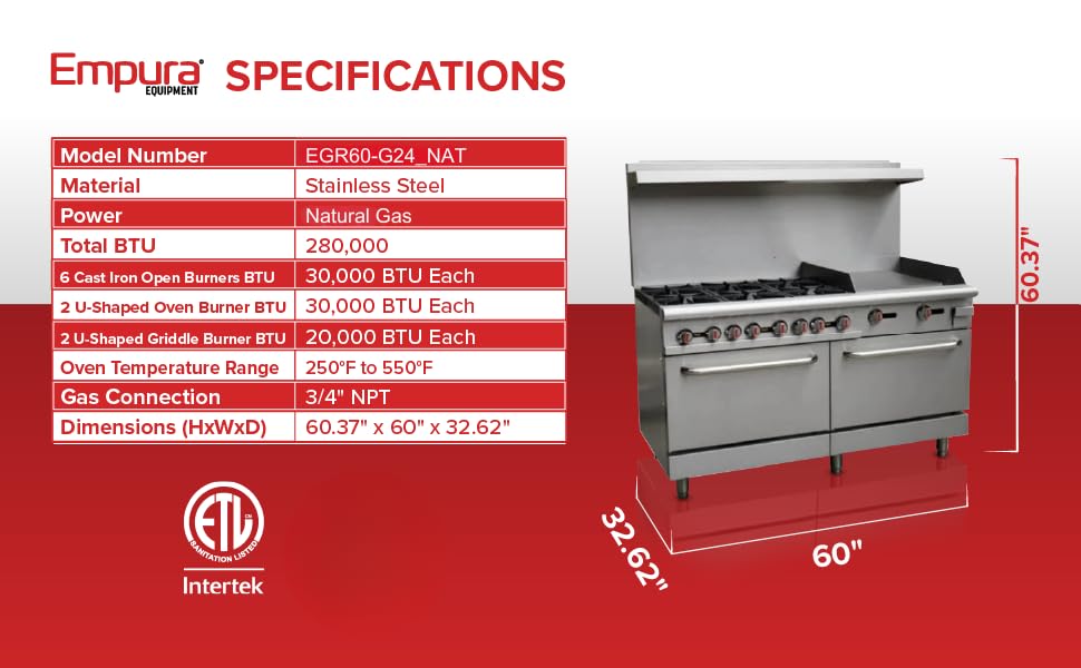 POWERFUL COOKING PERFORMANCE: The Empura natural gas range is equipped with six powerful 30,000 BTU cast-iron burners, a 40,000 BTU griddle, and two 30,000 BTU standard ovens, delivering a total of 280,000 BTU. This natural gas range is designed to handle high-volume cooking in busy commercial kitchens with ease.