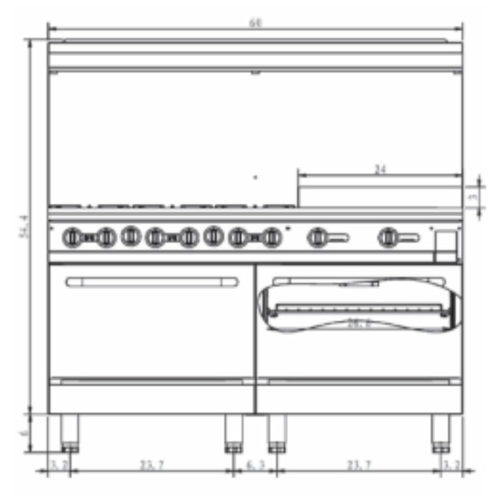 VERSATILE COOKING SURFACE: Featuring a spacious 60" width, this range includes a 20" wide griddle with a 3/4" thick polished steel plate for even heat distribution. The combination of burners and griddle allows for simultaneous cooking of multiple dishes, enhancing kitchen efficiency and productivity.
