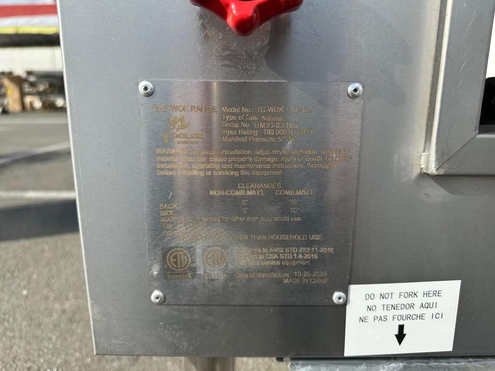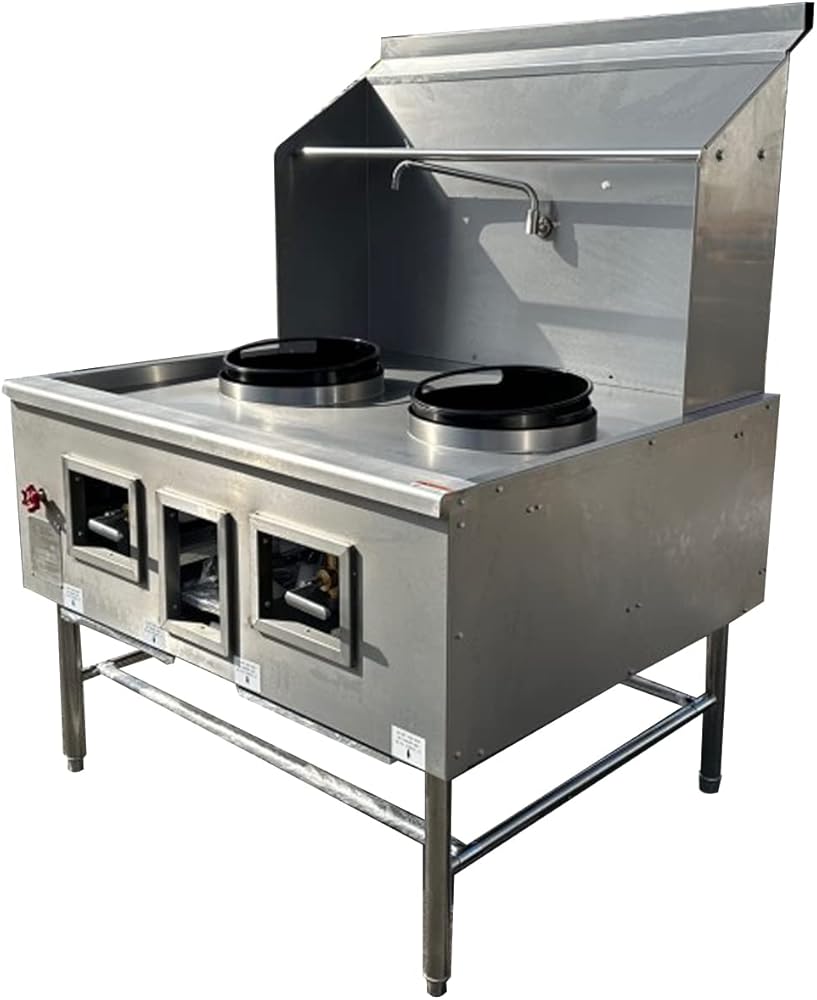 cooler depot Chinese Wok Range with Waterfall, 47"Width 2 hole burner ring propane/natural gas LP NG, NSF Certified Dimension: 47"Width X 39"Depth X 63"Tall. Material: Stainless Steel designed to be long lasting and heavy duty.Nsf/Etl Certified by health department. Fuel system: Use Natural Gas or Propane. 120,000 BTU for each burner , with 18 burner tips. Two 13" ring. Feature: Comes with Water Faucet, 1/2 inches input water line, drain pipe. Splash board on the back.