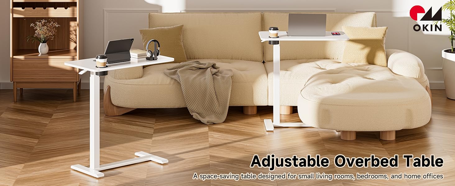 【Hidden Swivel Casters】Okinmobile standing desk overbed table is equipped with 4 hidden casters which is smooth and can rotate 360 degrees that glide effortlessly over carpet, hardwood floors, and tile. The wheels are very quiet and produce less than 50dB of noise。 It won't disturb others when you move the small desk for bedroom. The small table 1.38" base foot height allows it to be easily placed under most furniture, making it ideal for small apartments, dorms, or limited spaces