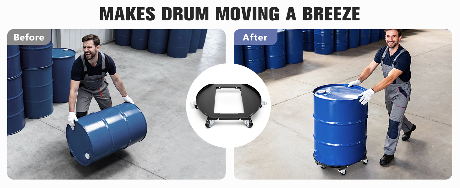 【Large Platform for Versatile Use】The expanded platform offers greater surface contact, securely holding 20–55 gallon oil drums, chemical barrels, wine kegs, as well as large trash cans, heavy planters, and water tanks. One barrel dolly cart handles a wide range of moving needs in garages, gardens, workshops, and factories